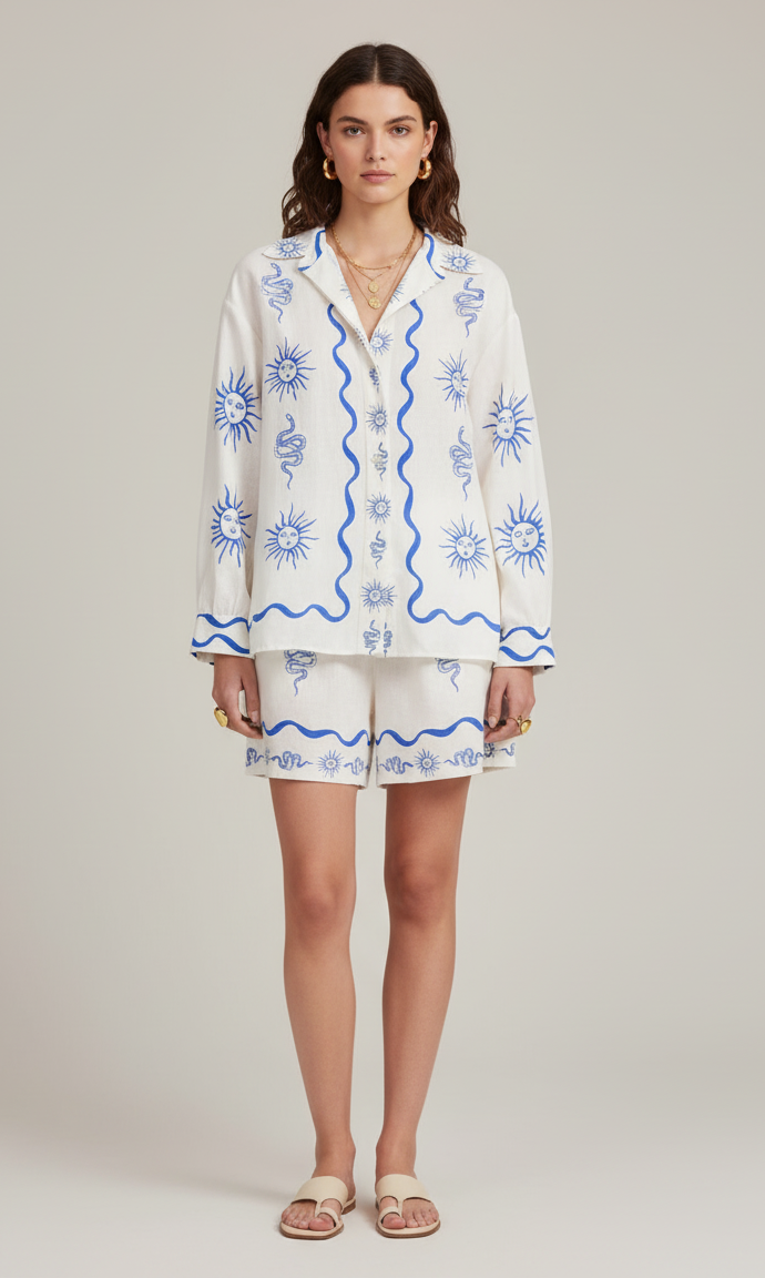 Embroidered Linen Shirt and Tie Waist Shorts Set