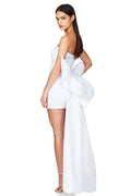 A stunning piece crafted from luxurious satin and silk. This dress features a chic bow accent at the back, adding a touch of sophistication to your evening ensemble.