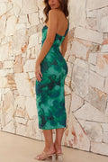 • Detail: Single asymmetric strap, vibrant waterprint design, midi length, side zip closure