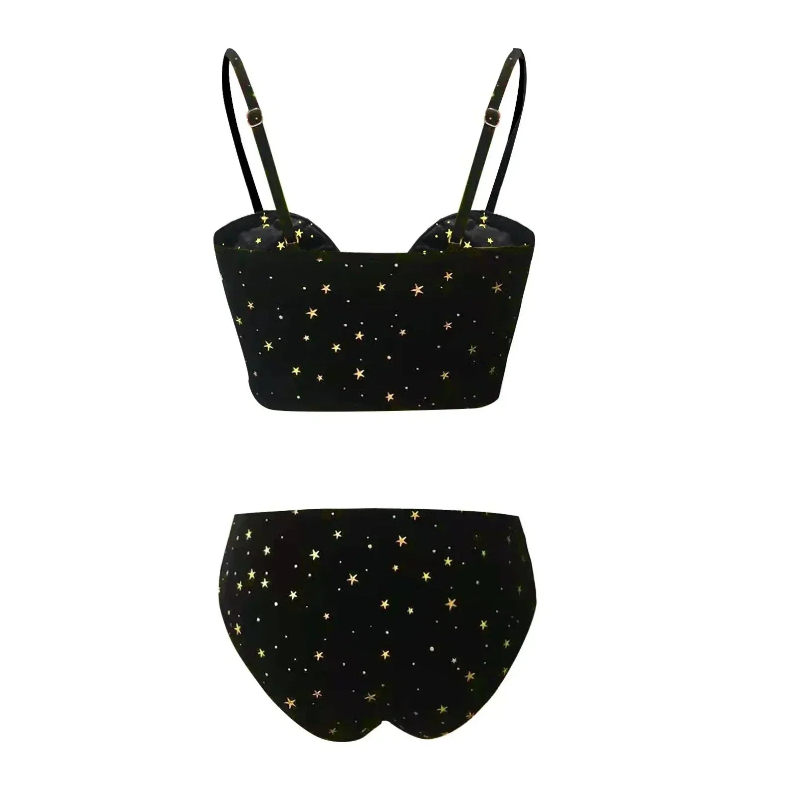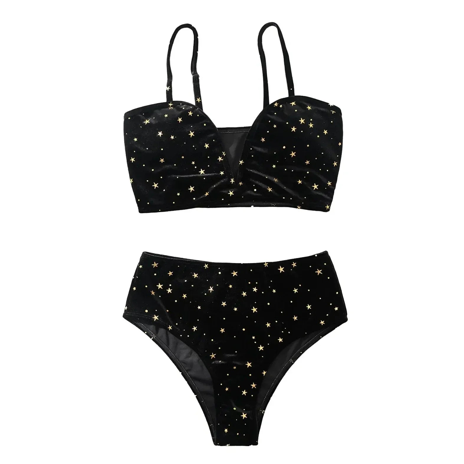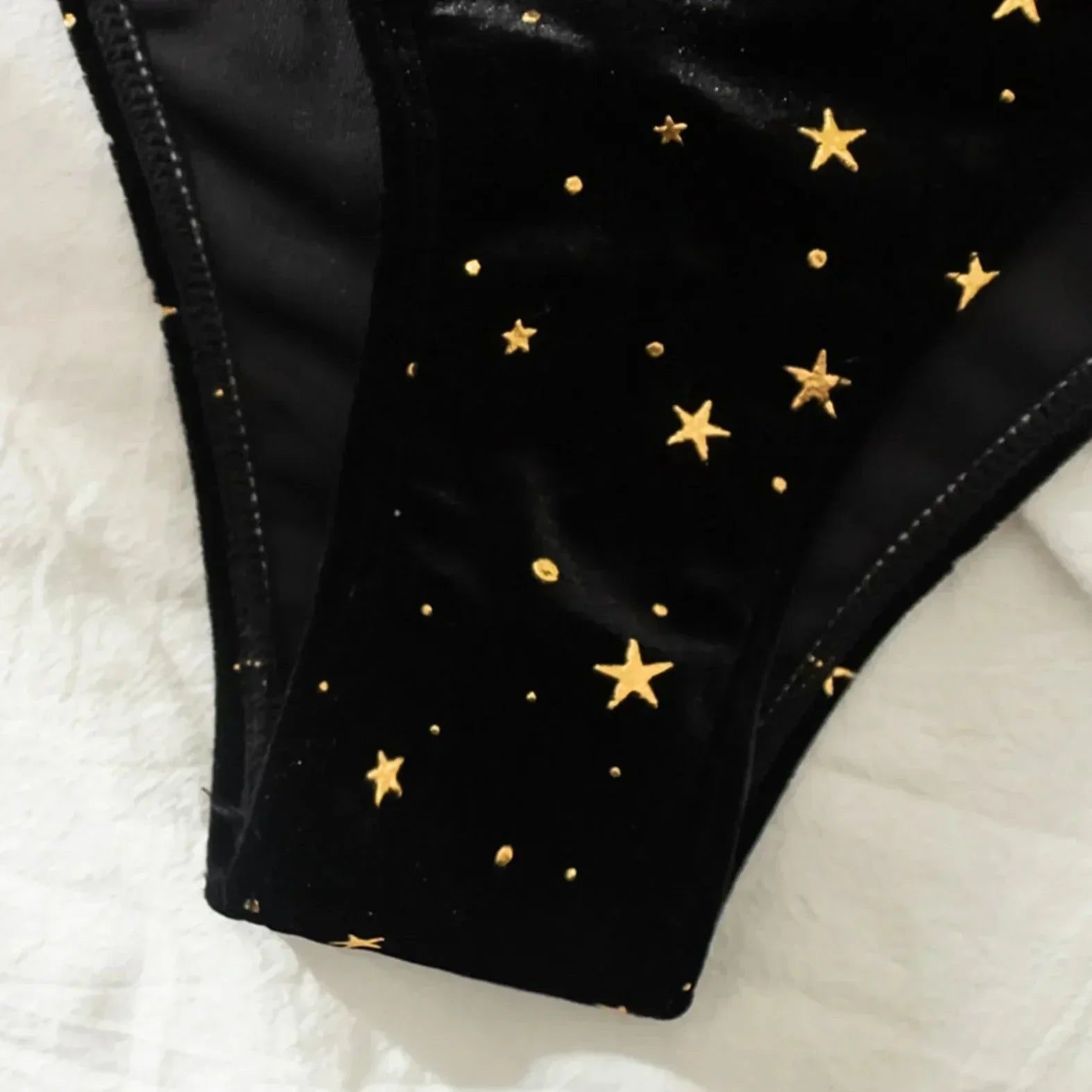 A luxurious and elegant swimwear option that is sure to make you stand out. This swimsuit features a black velvet fabric with small gold stars, adding a touch of glamour to your beach look. Here are the key features and benefits of this swimsuit: