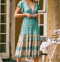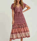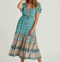 • Detail: V-neckline, flutter sleeves, tiered midi skirt, all-over boho print