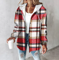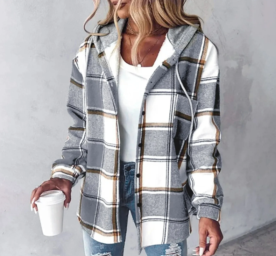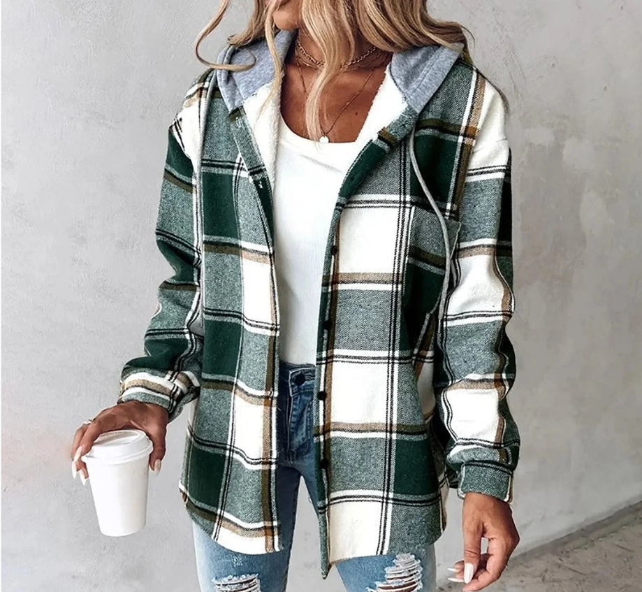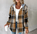 Layer the Bria Plaid Hooded Jacket over a fitted turtleneck and pair with jeans and ankle boots for a cozy, chic autumn look. Great for casual outings or weekend adventures.