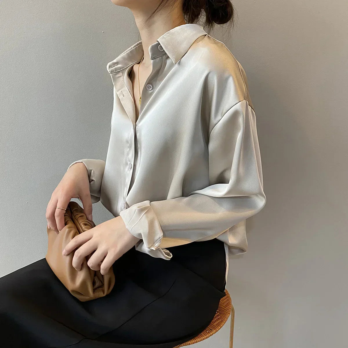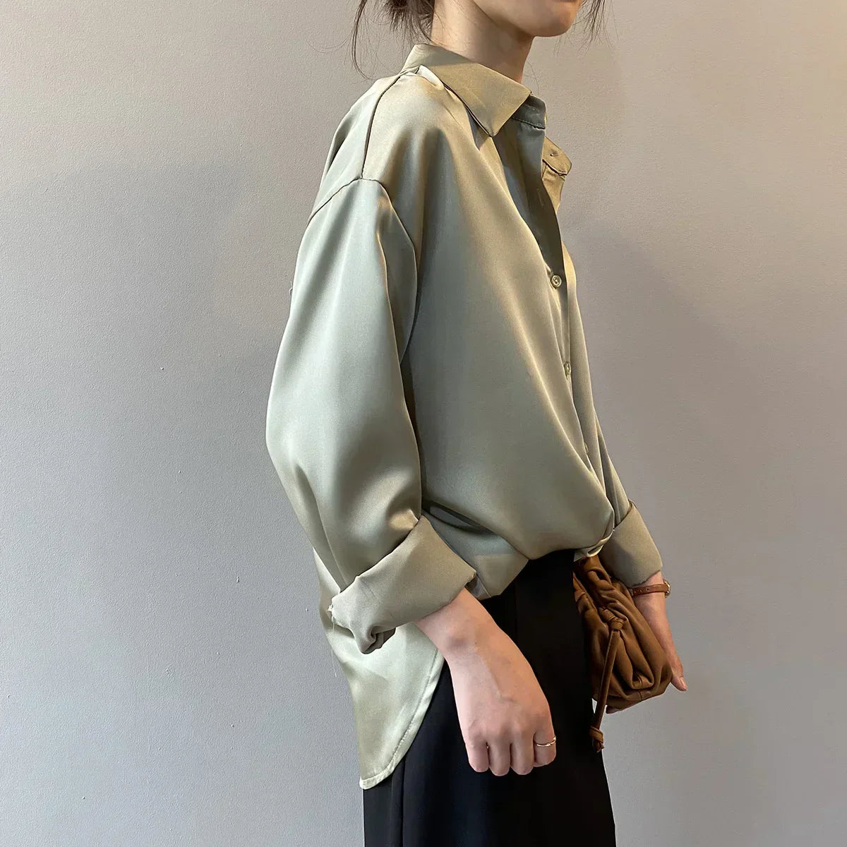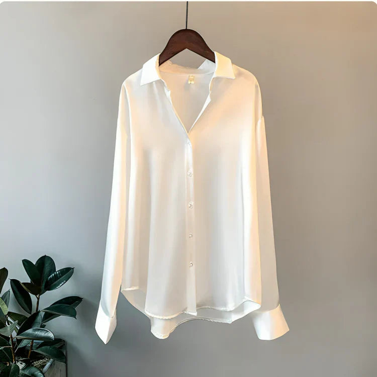 This is our Classic Button-Front Long Sleeve Satin Shirt