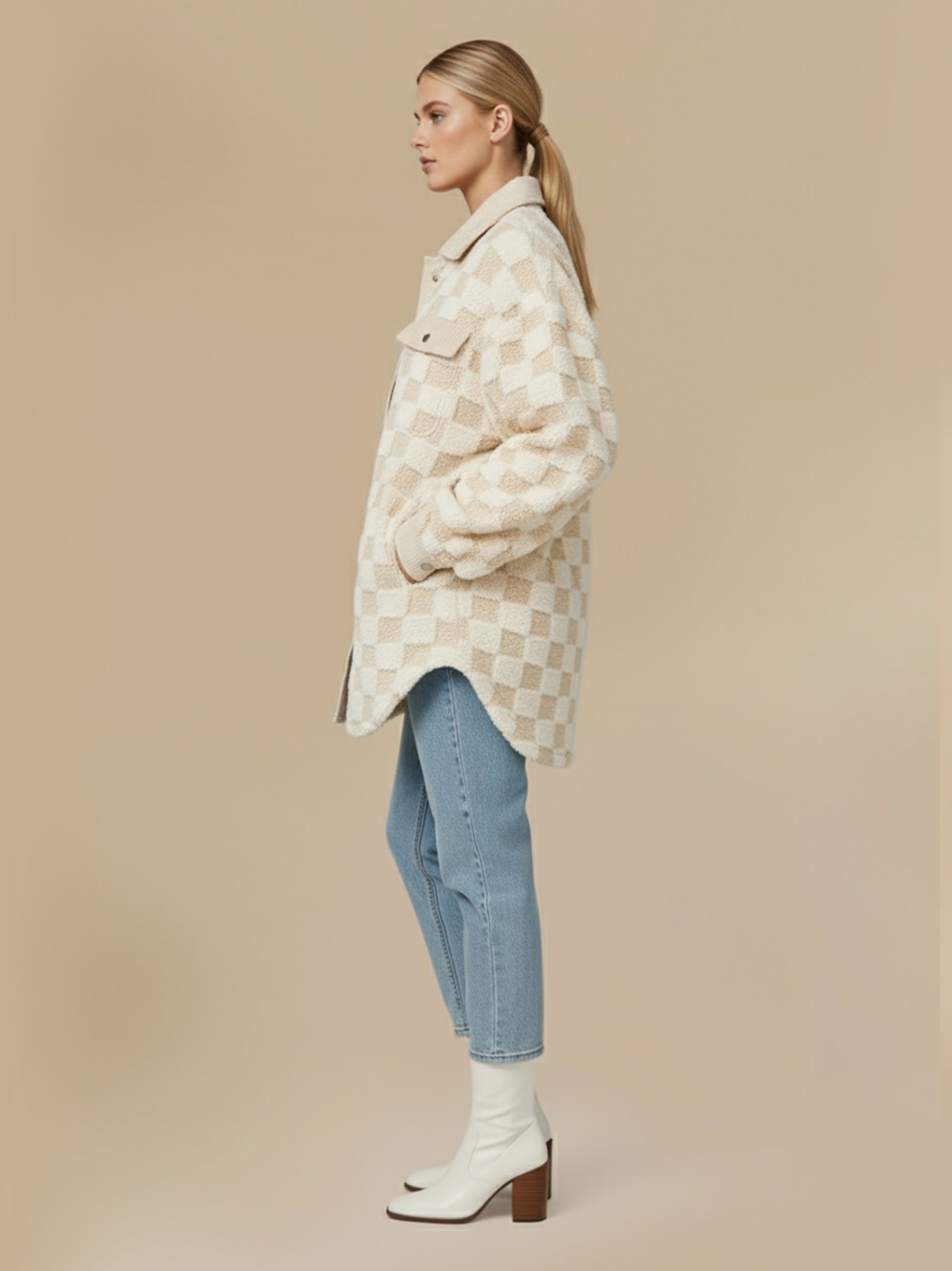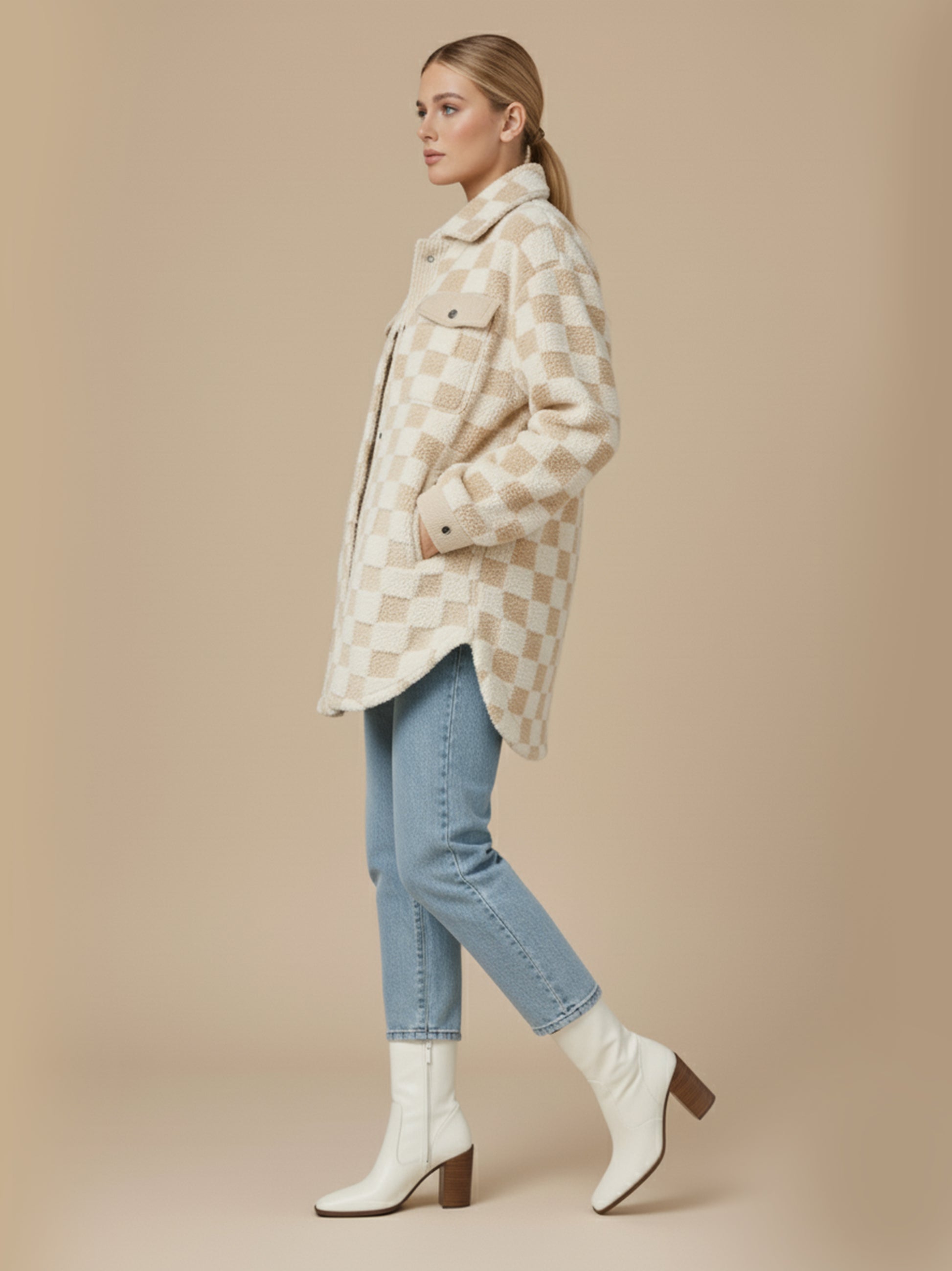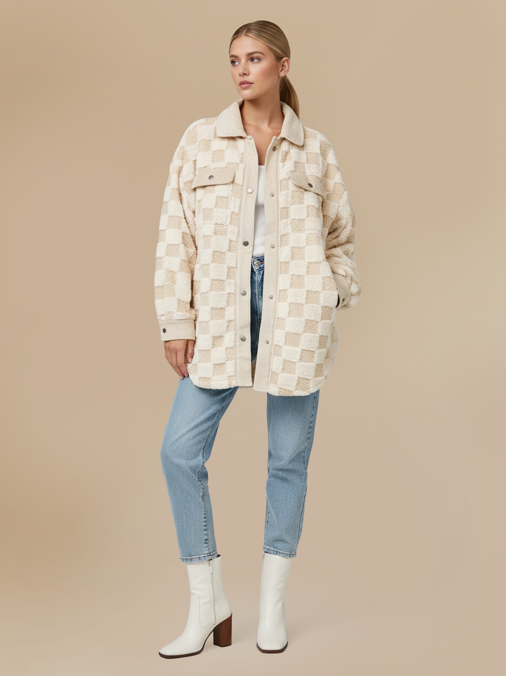 Cream Checkered Fleece Shacket