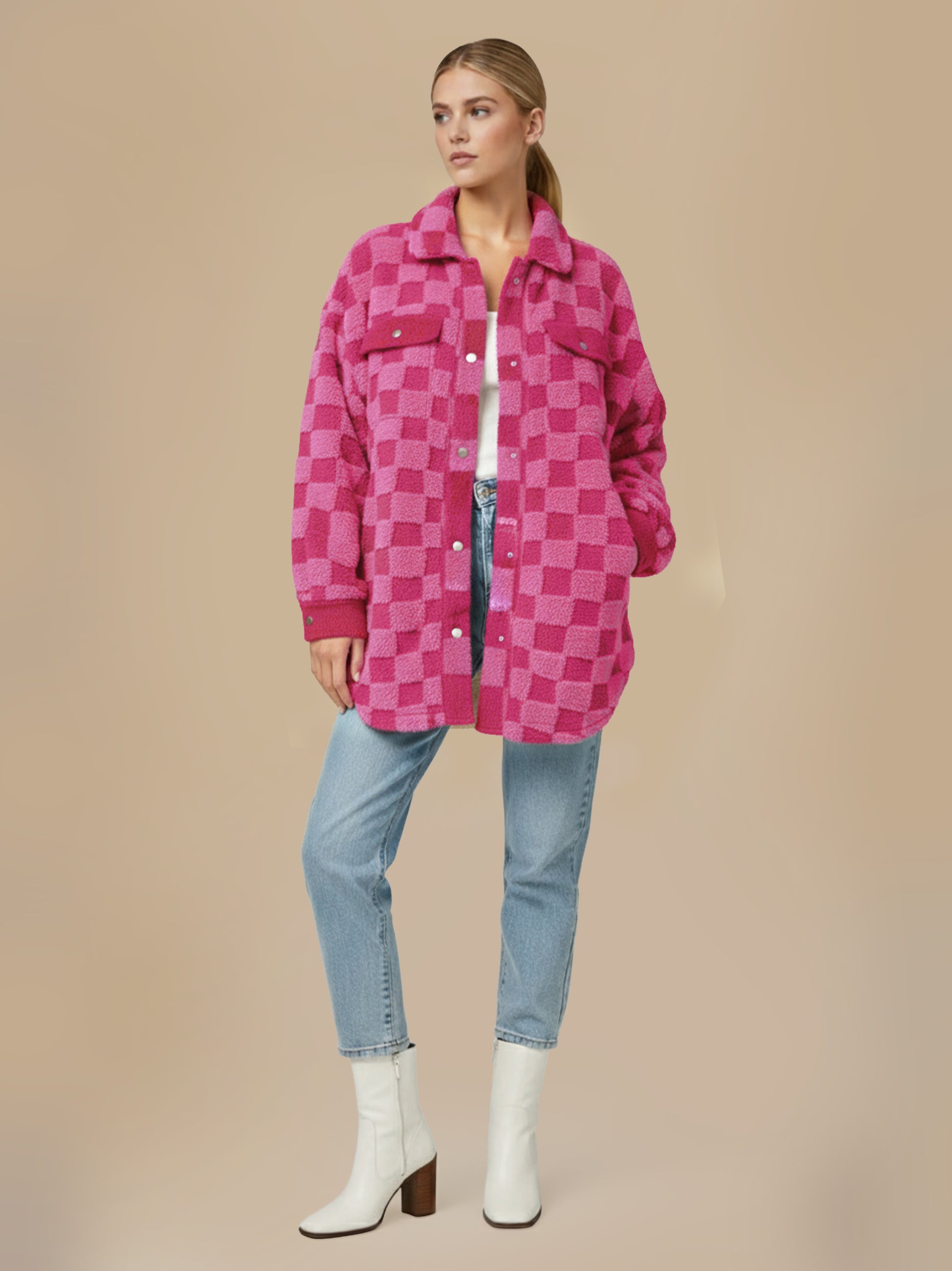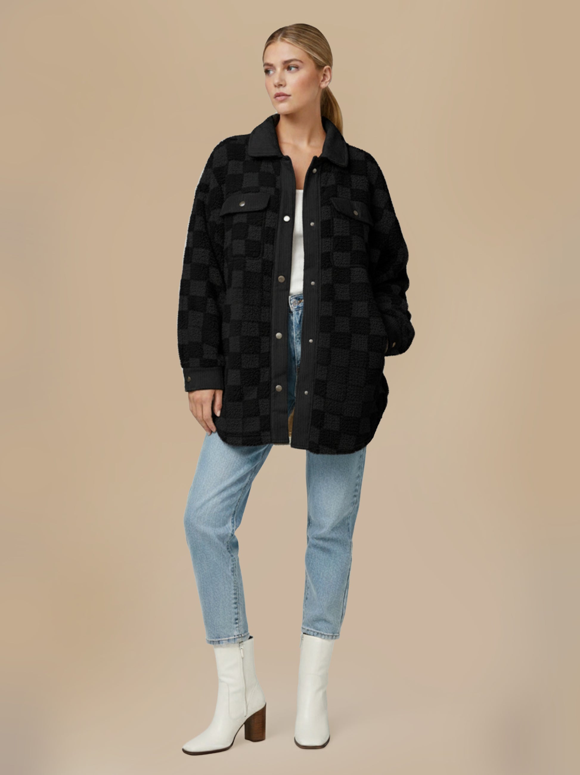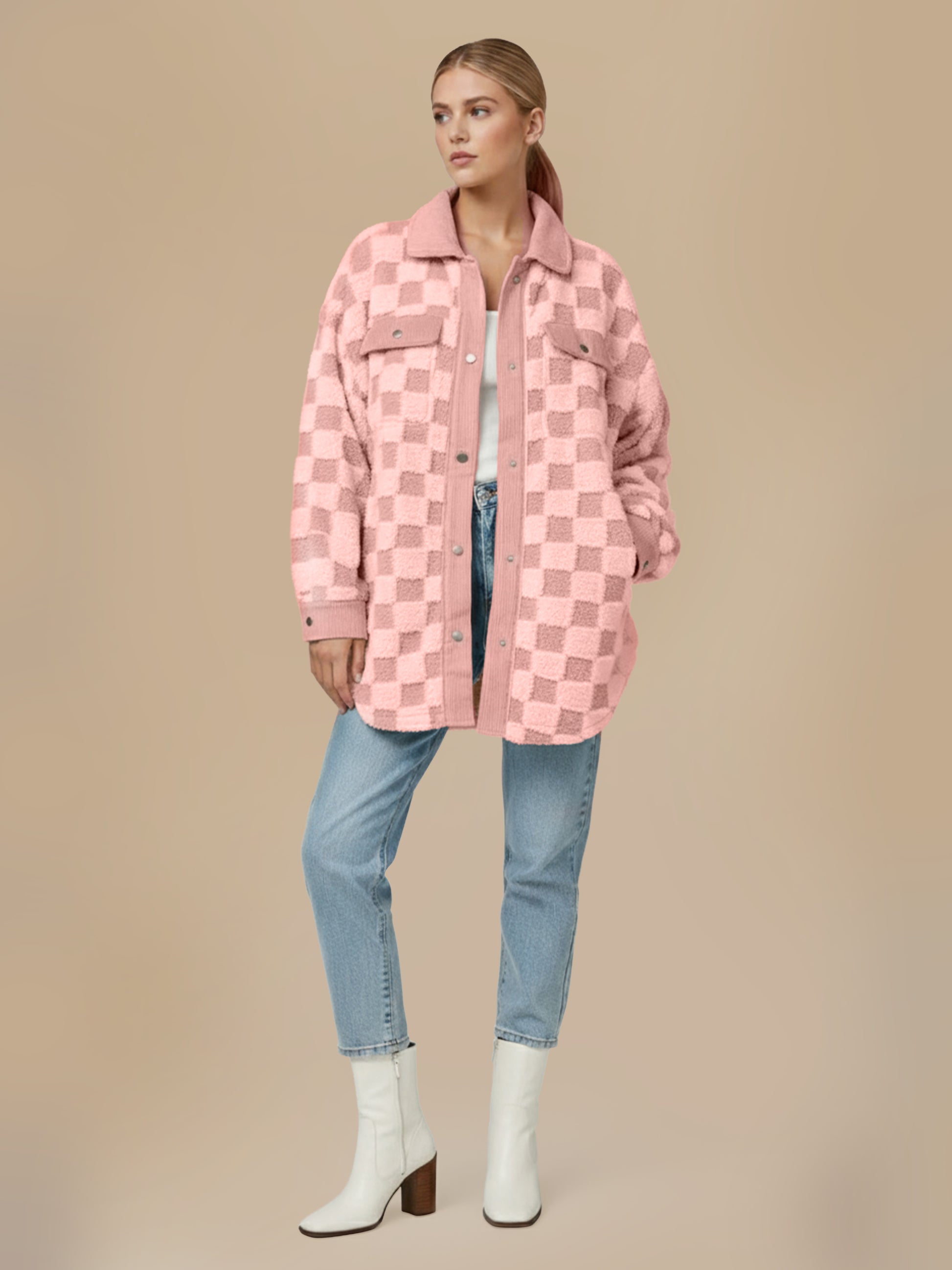 This is our Cream Checkered Fleece Shacket