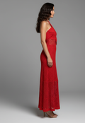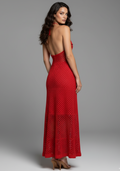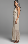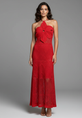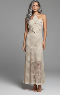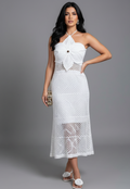 Detail: Halter neck with central floral motif and full open-knit midi skirt