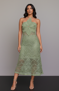 This halter-style dress is a true standout, featuring an intricate crocheted floral bodice and an airy, open-weave skirt. Perfect for summer soirées, garden gatherings, or seaside escapes, it balances elegance with artisan appeal in a refreshing sage hue.