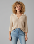 Detail: Crocheted pattern, V-neckline with collar, 3/4 sleeves