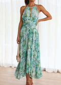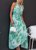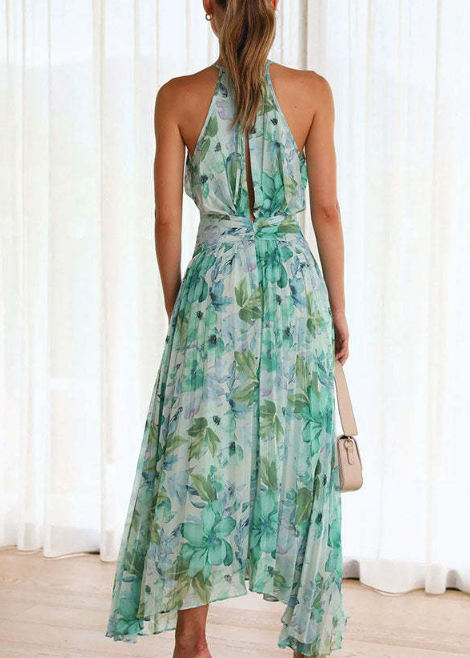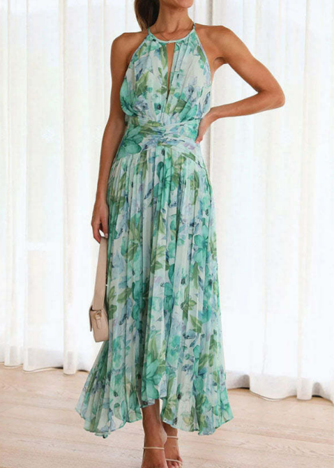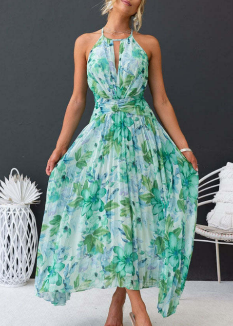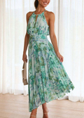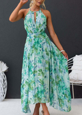 Make a graceful statement with our Elisa Flower Pleated Dress, featuring a fresh floral print in shades of green and blue. This halter-neck design accentuates your neckline and flows into a pleated, airy skirt, perfect for summer events or beachside getaways.