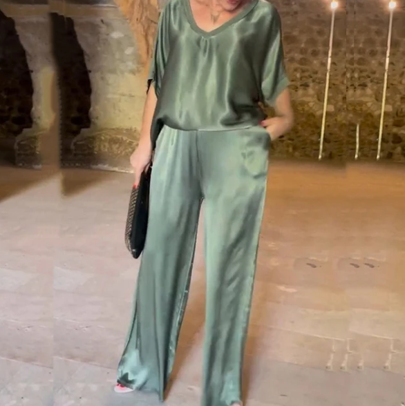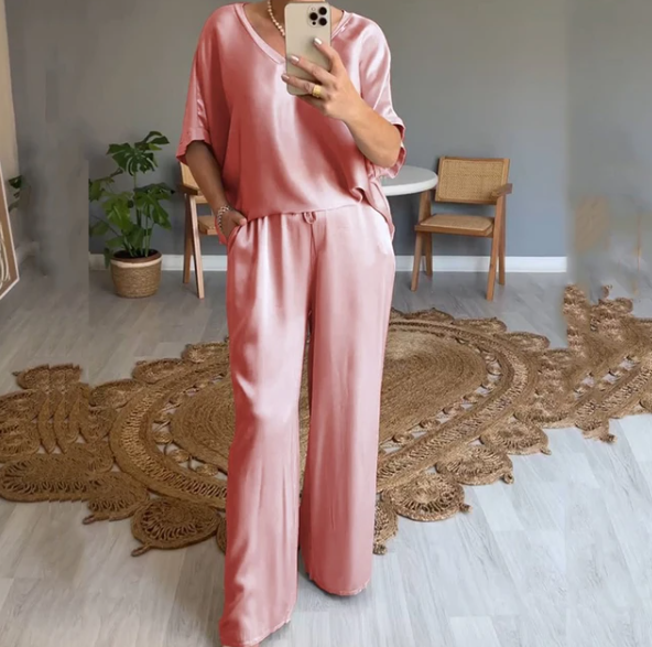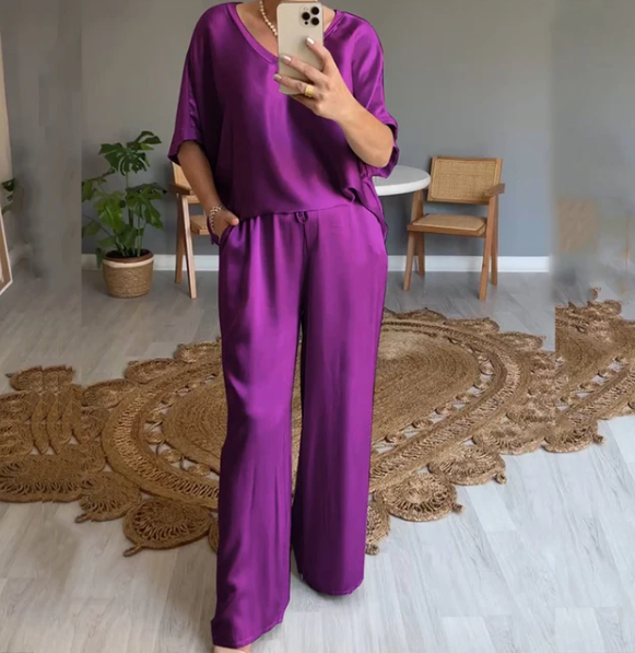 A luxurious and elegant ensemble designed for sophisticated comfort. This coordinated set features loose-fitting satin pants and a matching top, exuding effortless style and glamour.