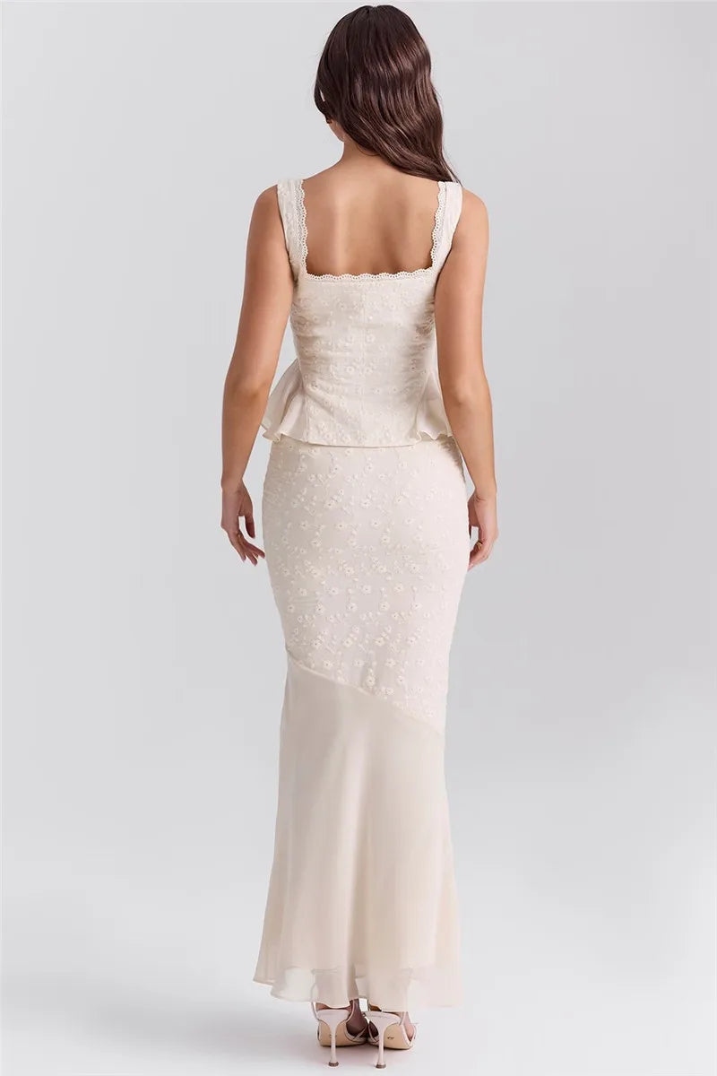 A perfect blend of sophistication and contemporary style. This set, featuring a long skirt and a sleeveless top, is designed to make you look effortlessly chic and elegant for any occasion.
