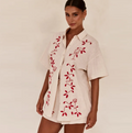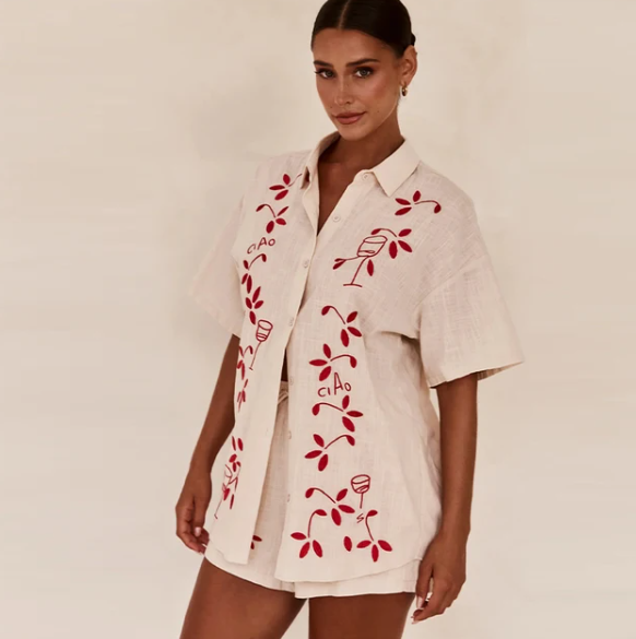 This is our Embroidered Linen Shirt and Tie Waist Shorts Set