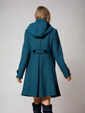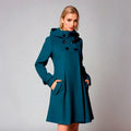• Detail: Button-up front, attached hood, side pockets, flared hem