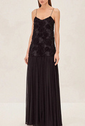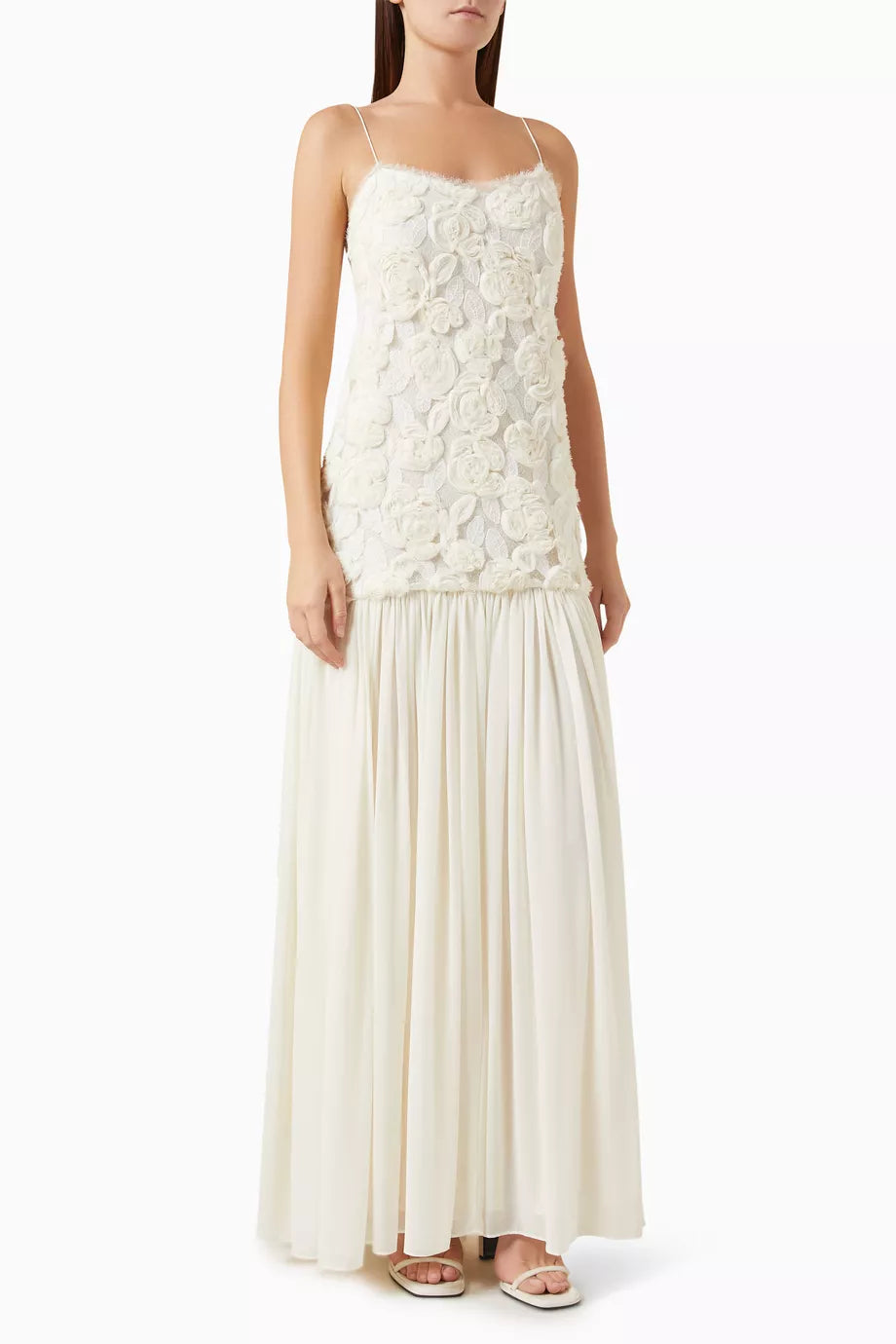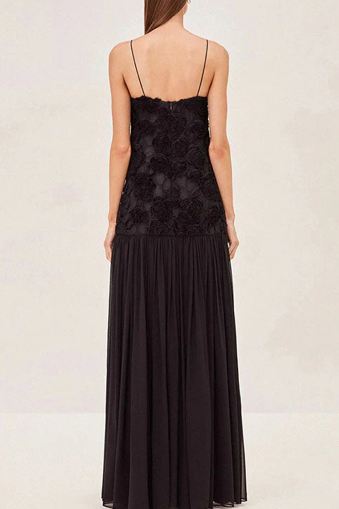 Designed with delicate floral appliqués and a whimsical patchwork motif, this flowy maxi dress brings effortless charm to any occasion. The slim spaghetti straps and gentle silhouette flatter your shape while allowing the intricate detailing to shine.