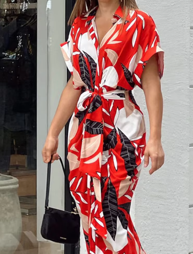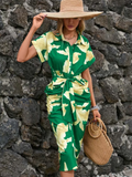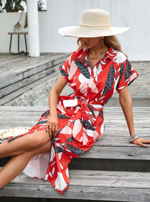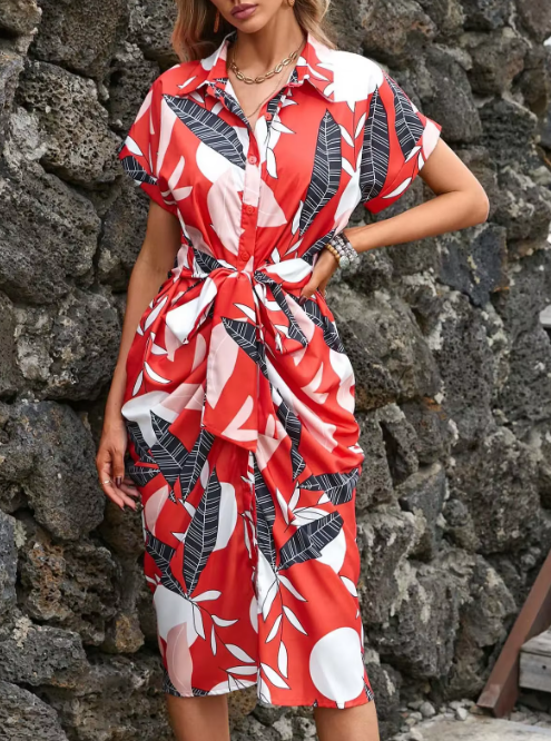 • Detail: Floral print, button-down front, tie waist, short sleeves, knee-length