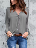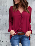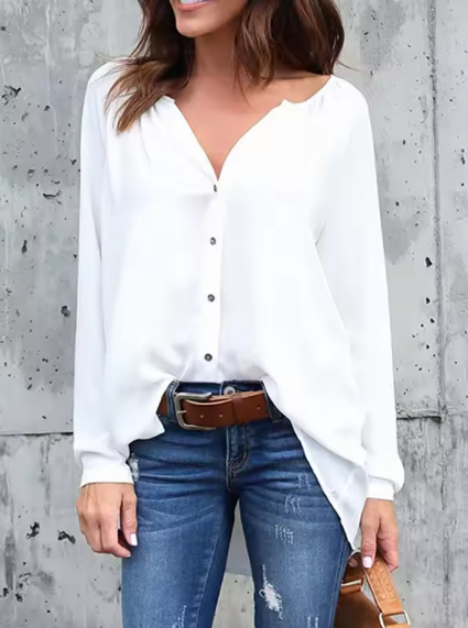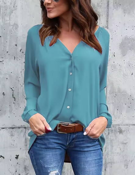 Polished, comfortable, and endlessly wearable. The Flowy Button-Down Blouse is your go-to for effortless everyday style — designed with a flattering V-neckline, breezy silhouette, and a touch of structure from the button-down front.