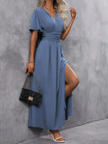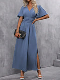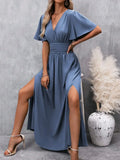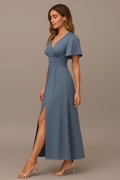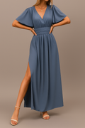 • Detail: Flutter sleeves, thigh-high slit, V-neckline, floor-length
