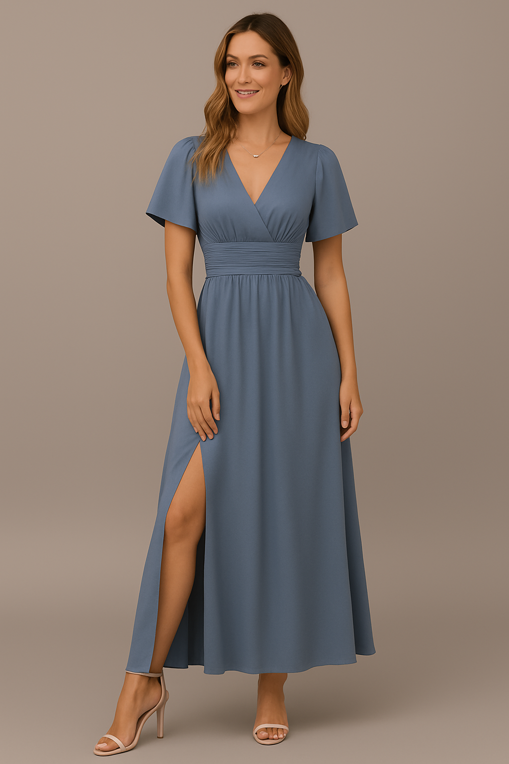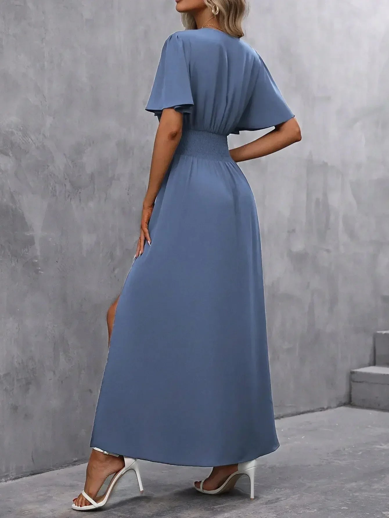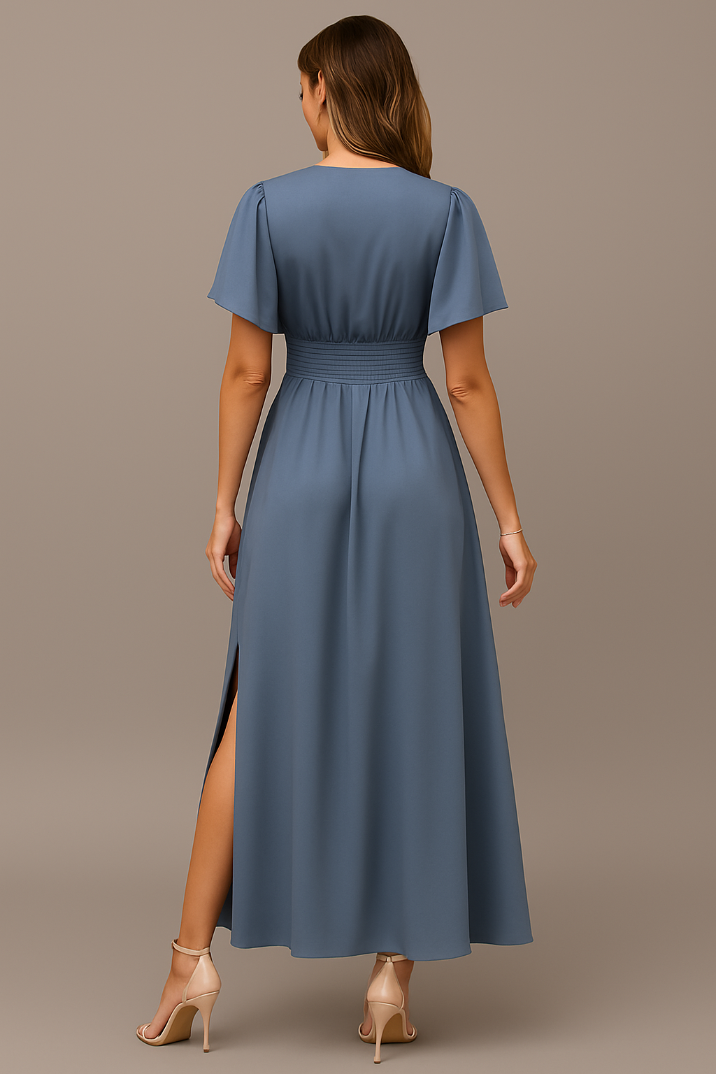 A timeless maxi silhouette with delicate flutter sleeves — this dress is made for special occasions and effortless sophistication.