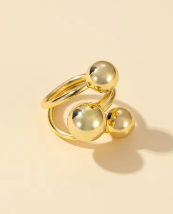 A modern take on minimalist elegance, this sculptural gold-tone ring features three polished spheres set on an open band. Its fluid lines and bold silhouette bring effortless sophistication to every gesture.