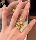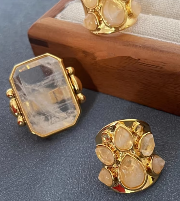 A modern take on earthy elegance, this ring features a transparent natural stone set in a sleek open brass band. It’s light-catching, eye-catching, and the perfect geometric piece to elevate your everyday or evening look.