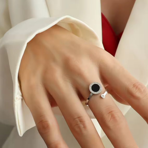 Bold yet timeless, this stainless steel ring features classic Roman numerals engraved around a sleek black enamel inlay. Finished with a hint of zircon sparkle, it's the kind of everyday luxury that pairs with anything—but feels like everything.