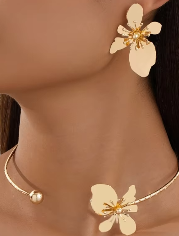 A charming duo that captures the delicate beauty of nature — this coordinated necklace and earring set features gold-tone flowers and butterflies, creating a graceful, feminine finish. It’s designed for women who love a little romance in their style.