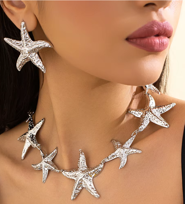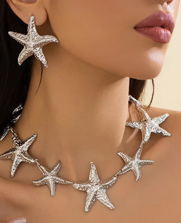 A bold blend of seaside charm and statement style, this necklace and earring set brings star-studded shine to your summer looks.