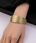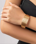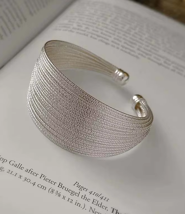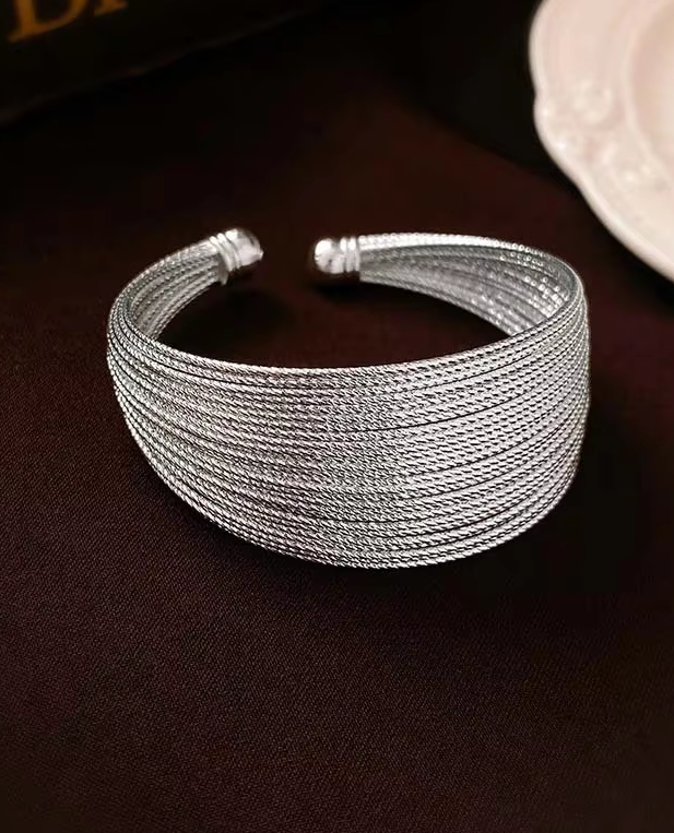 A bold composition of layered curves and high-shine metal, this wide cuff is designed to wrap your wrist in a statement of modern edge and sculptural grace.