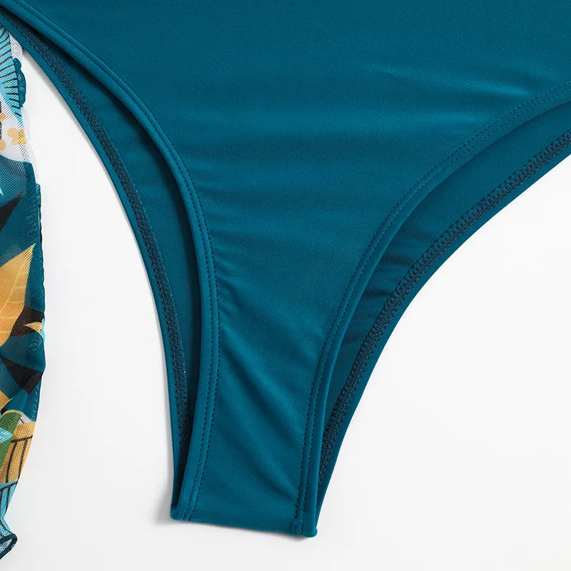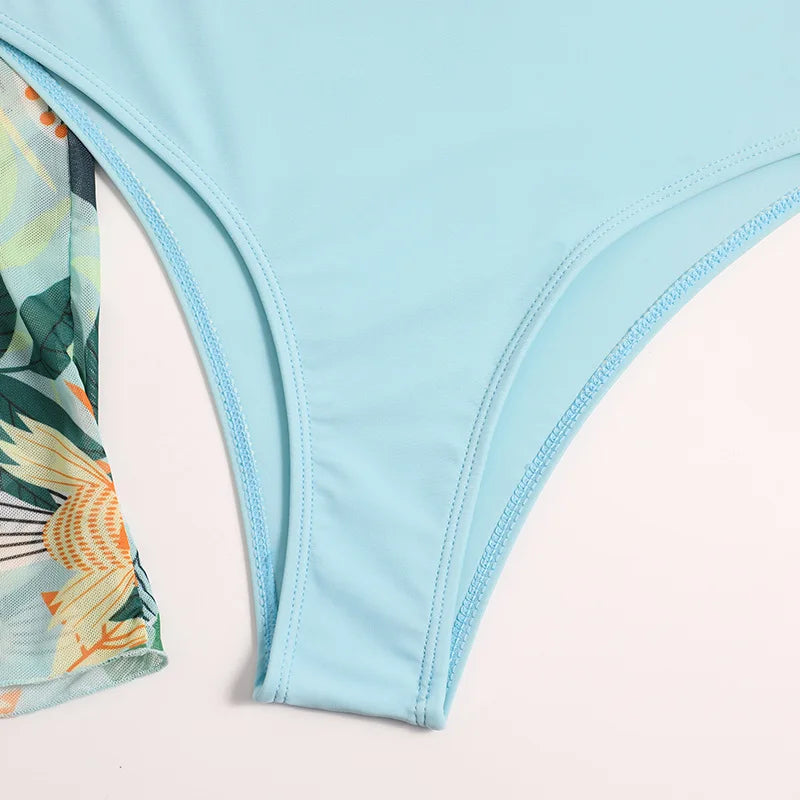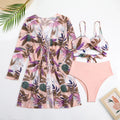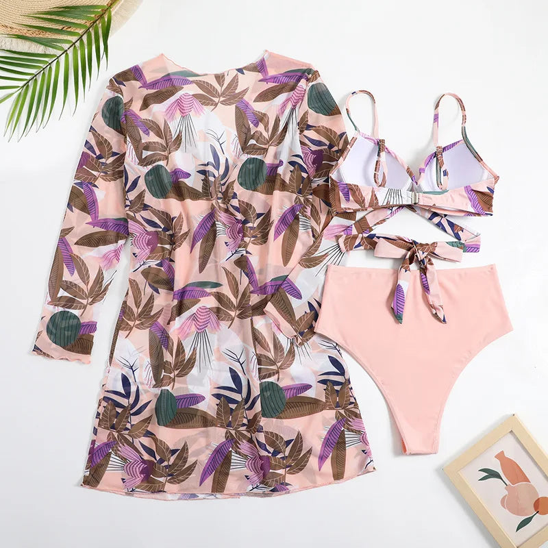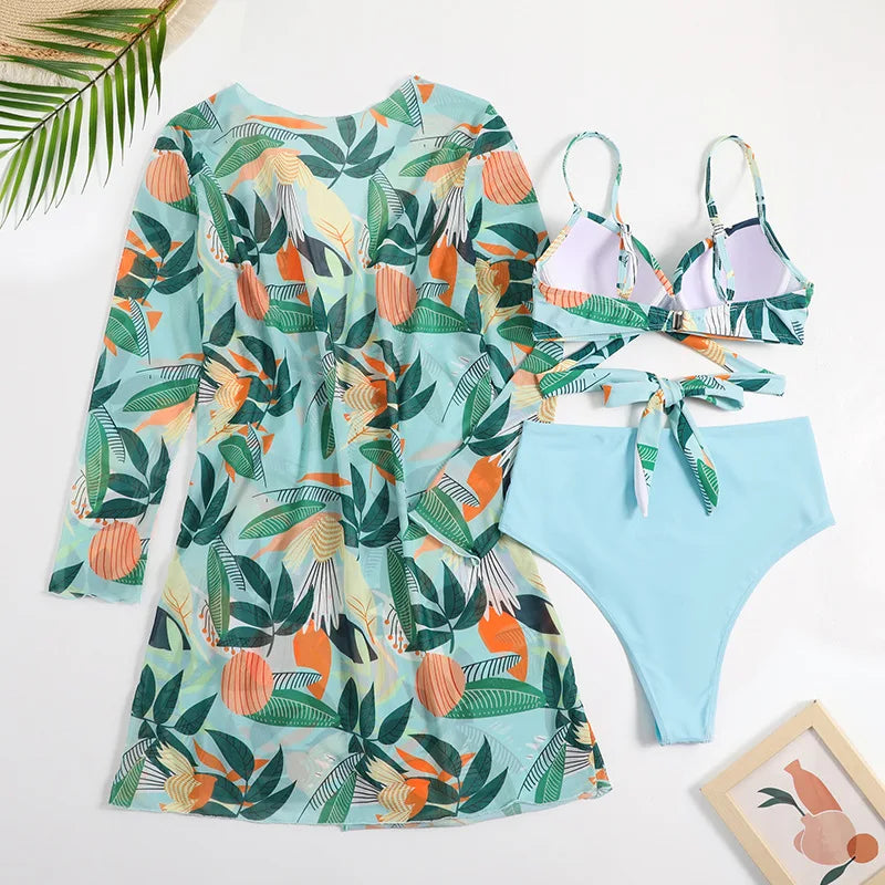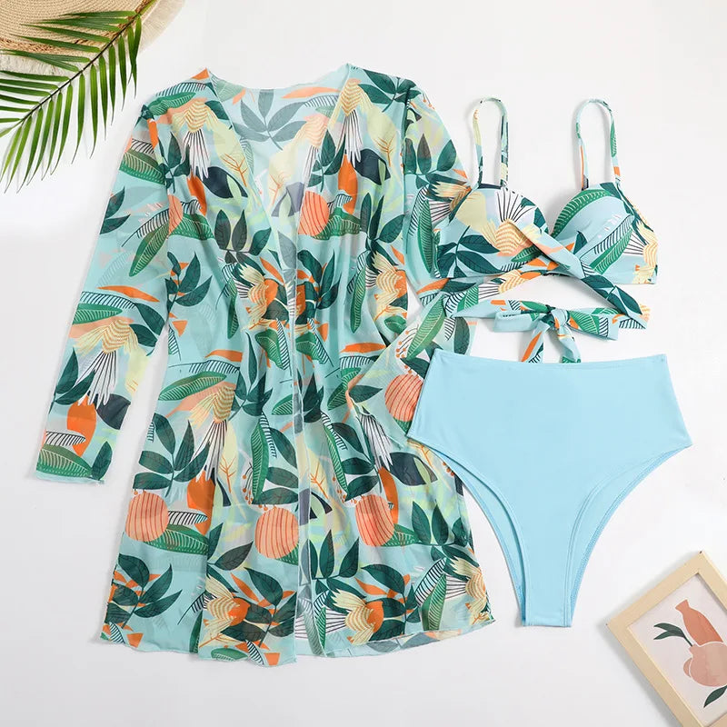 A stylish and versatile swimwear set that is perfect for your next beach or pool day. This set features a high waist bikini bottom in a solid color, a bikini top with a matching print, and a coordinating cover-up with the same print. Here are the key features and benefits of this swimwear set: