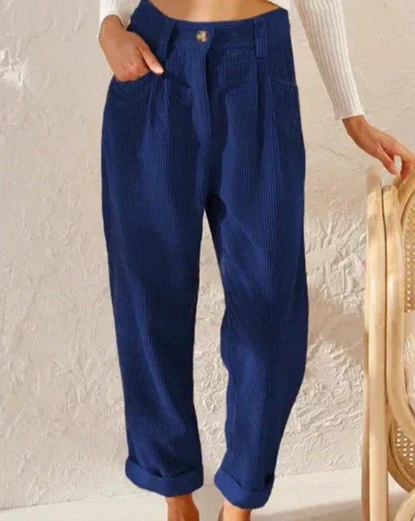 A textured twist on a classic silhouette — these corduroy pants offer a flattering high-rise fit and clean straight-leg cut, perfect for layering or wearing solo.