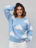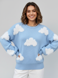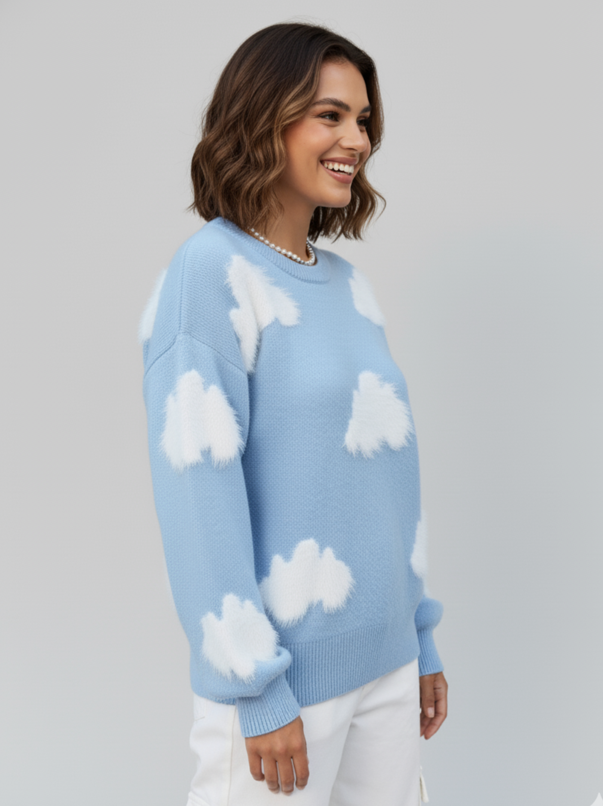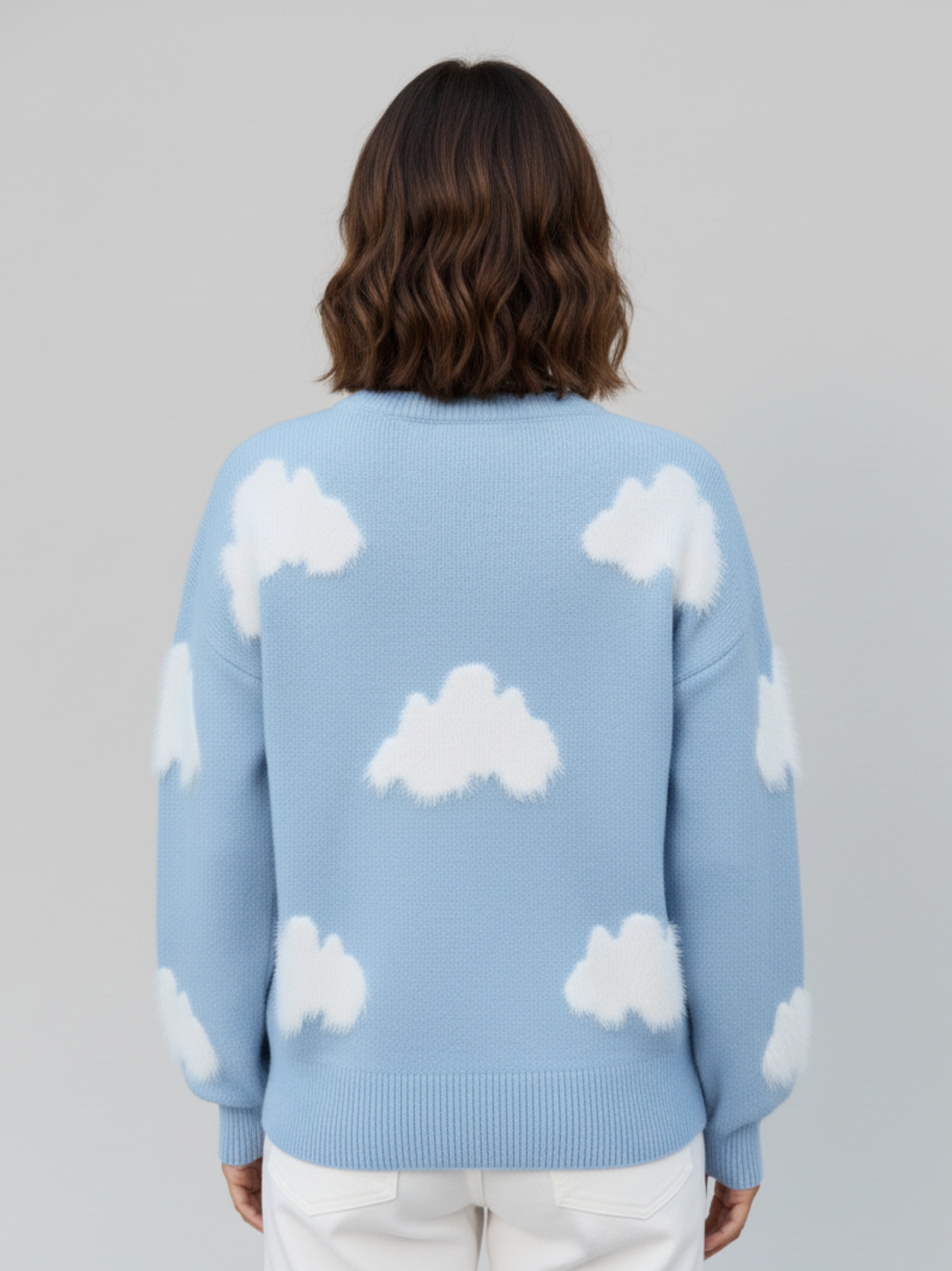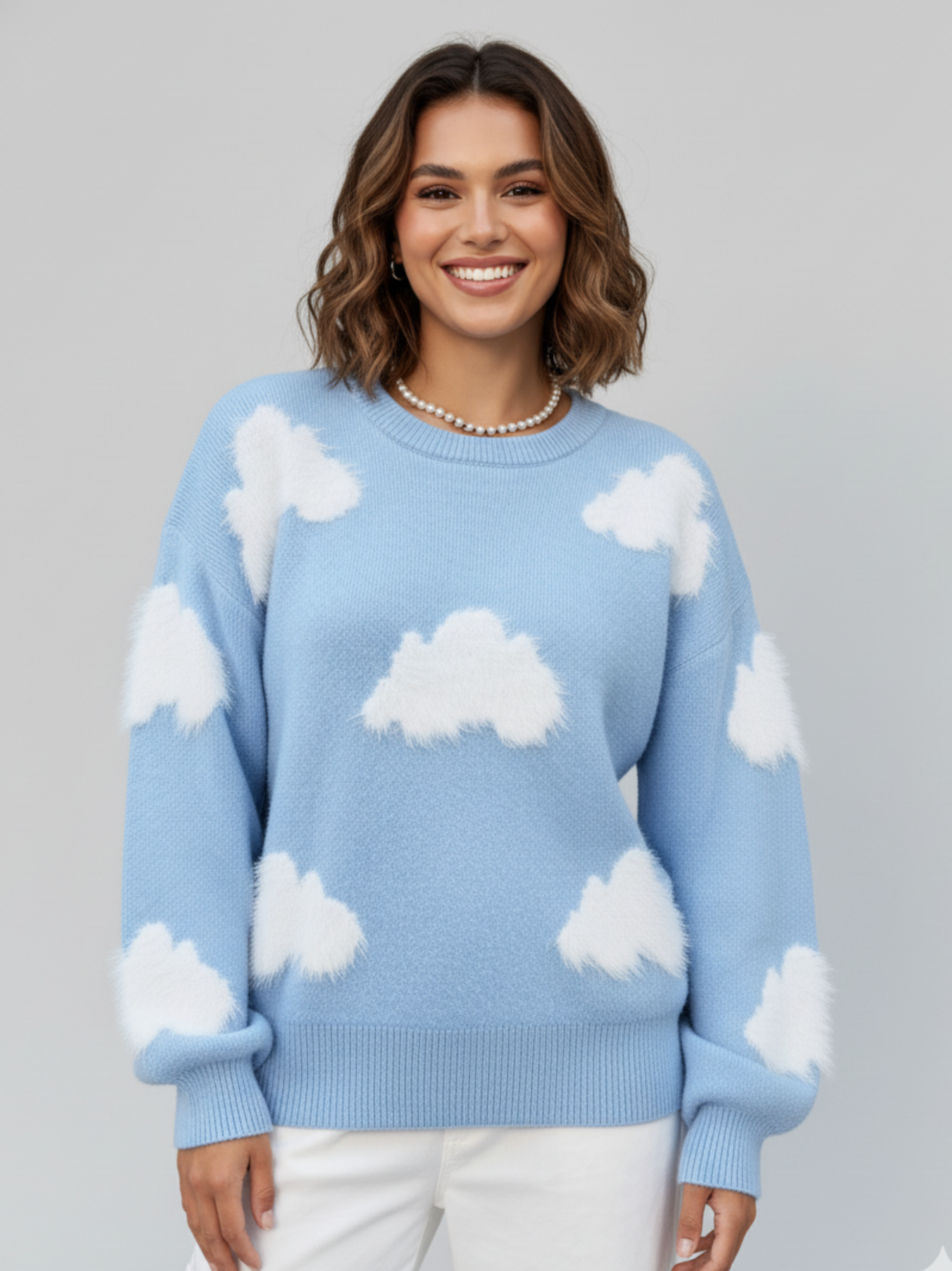 Add a touch of charm and comfort to your wardrobe with the Judy Cloud-Patterned Pullover. Enjoy the blend of whimsical design and cozy warmth with this unique piece, designed to be a favorite for both casual and stylish ensembles.