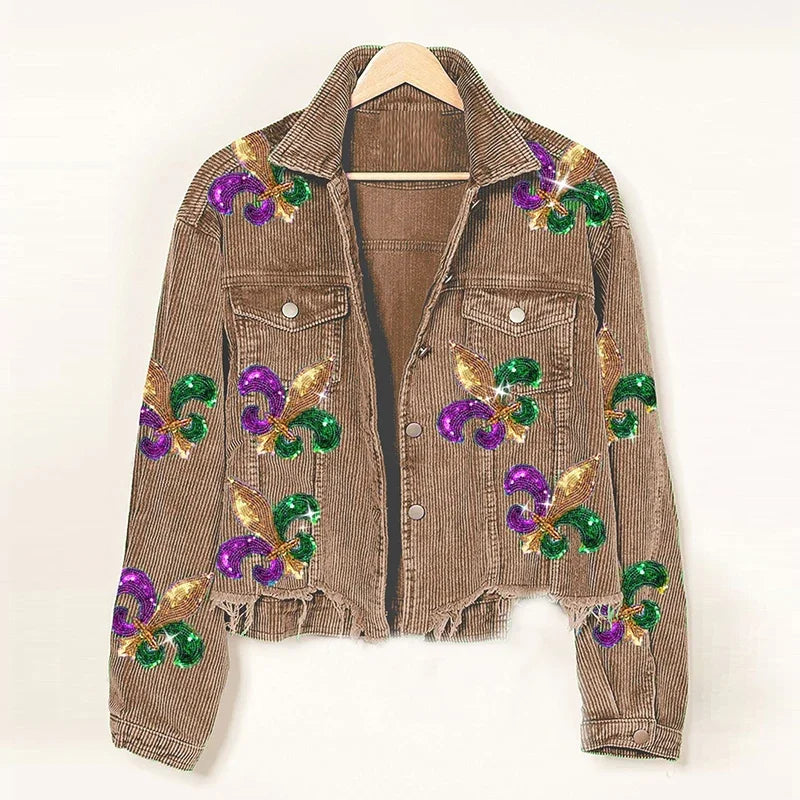A dazzling and stylish outerwear piece designed to elevate your wardrobe with its unique blend of texture and sparkle. This jacket combines the timeless charm of corduroy with the glamour of sequins, creating a statement piece that exudes sophistication and flair.