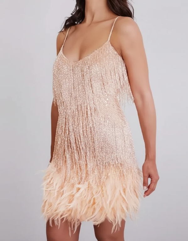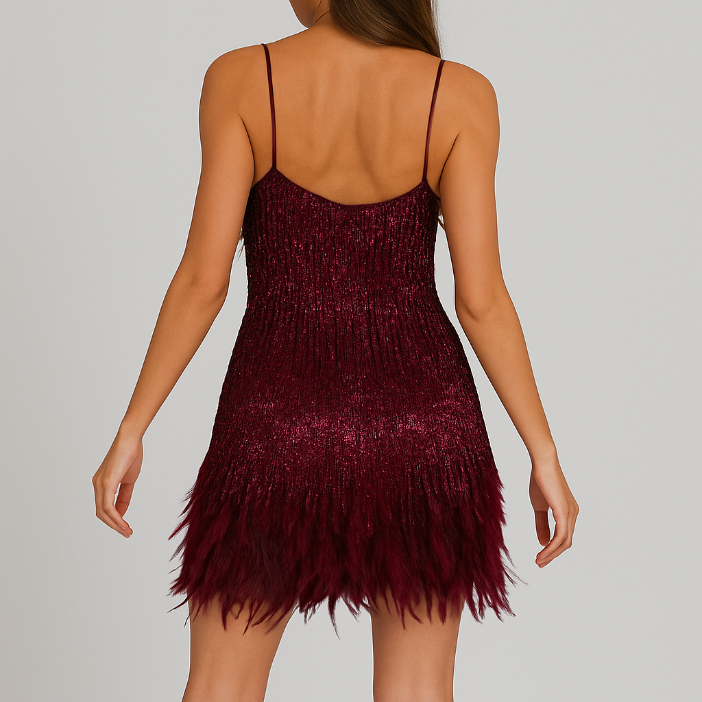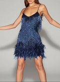 A bold, glamorous statement piece that’s perfect for turning heads at any event. This dazzling mini dress features shimmering sequins and playful feather details, creating a show-stopping look for parties, special occasions, or nights out.