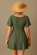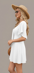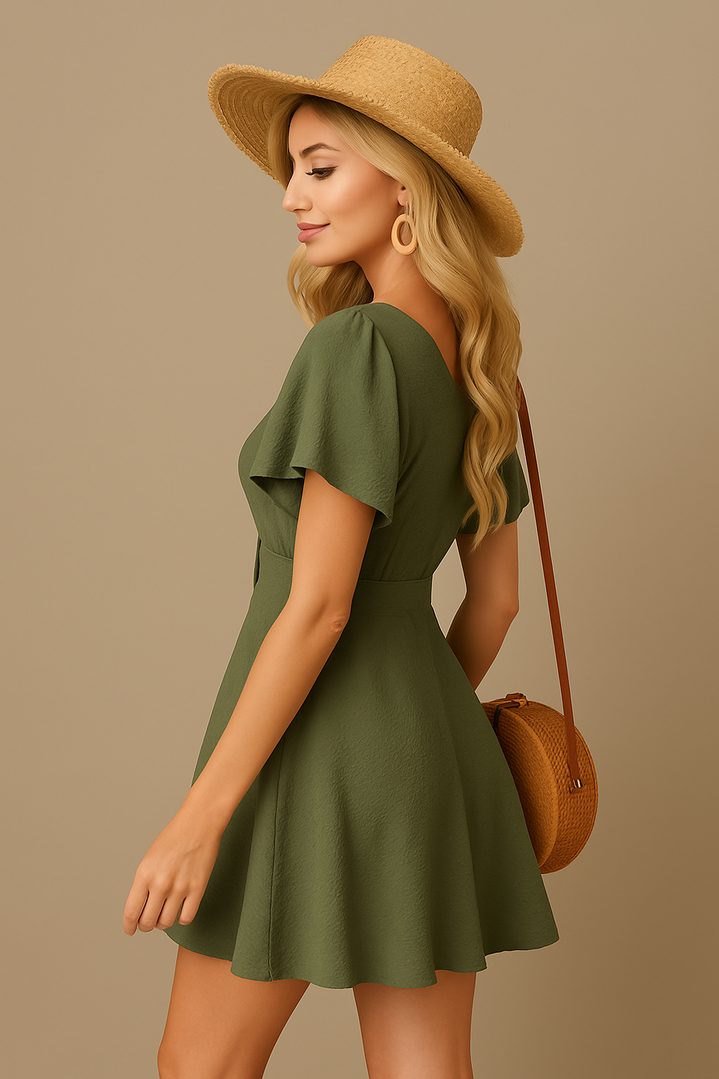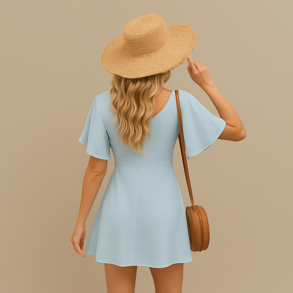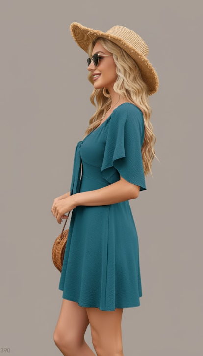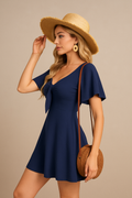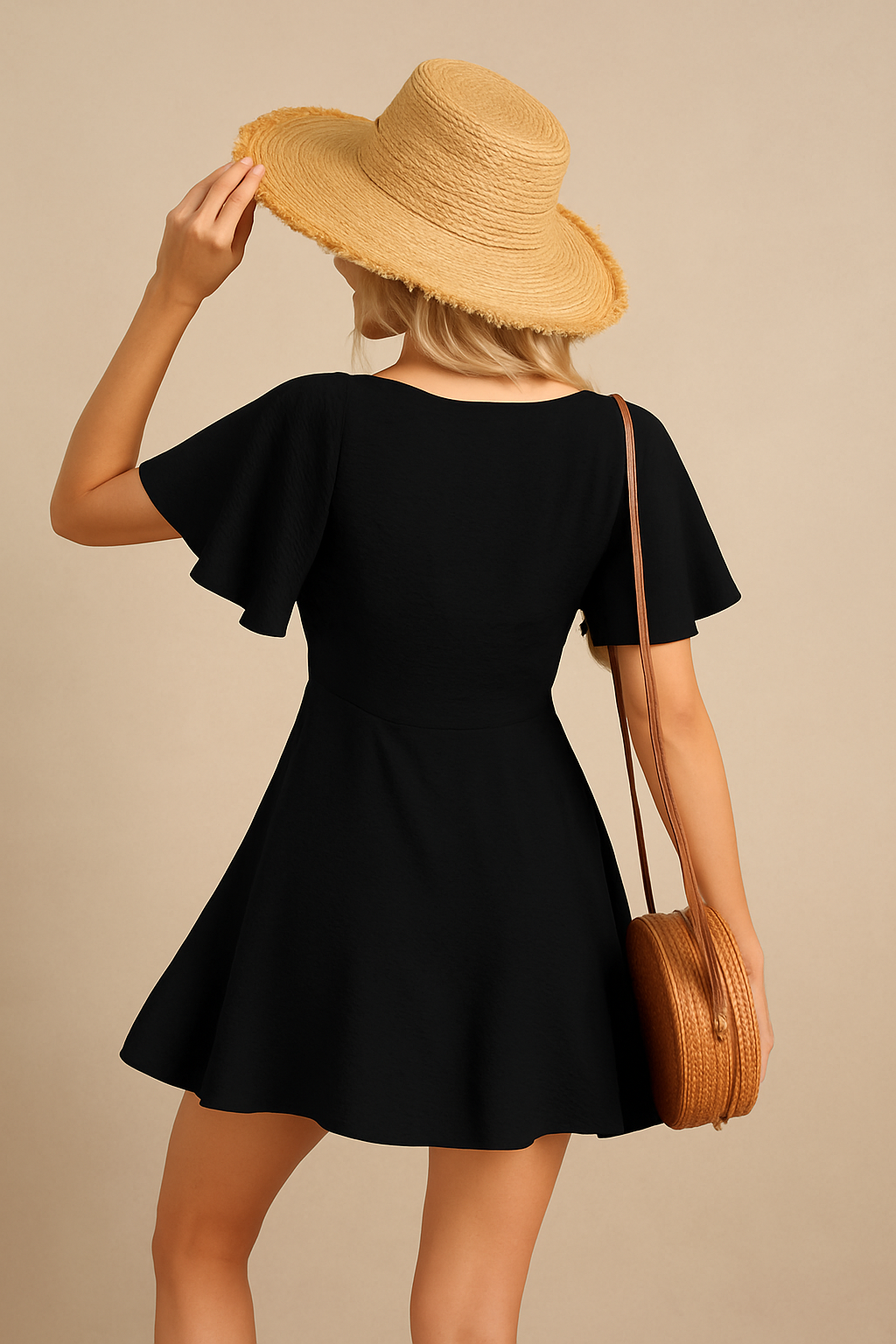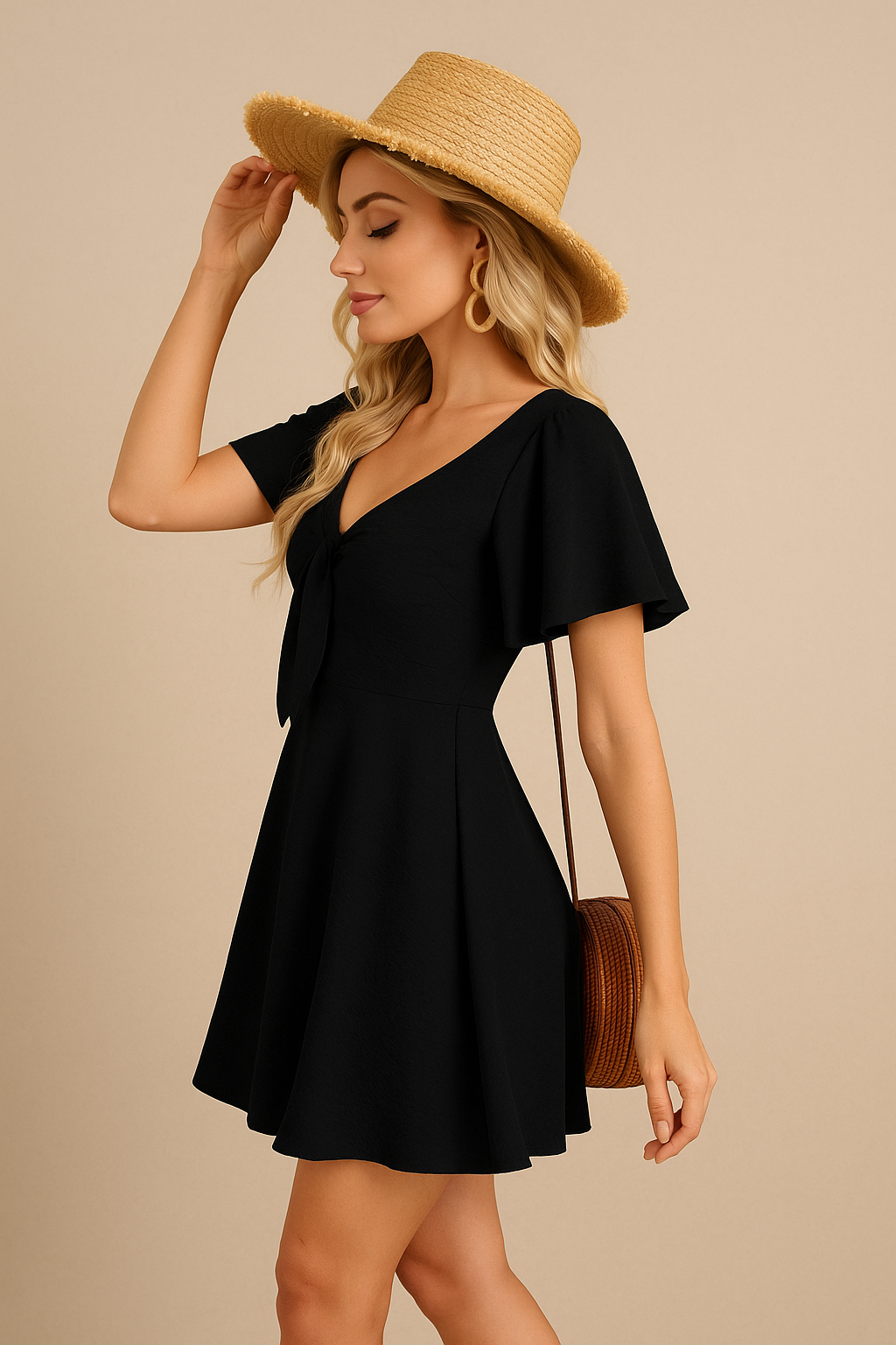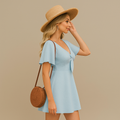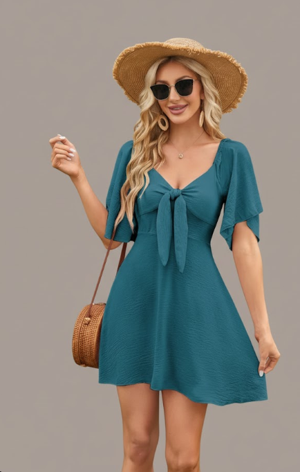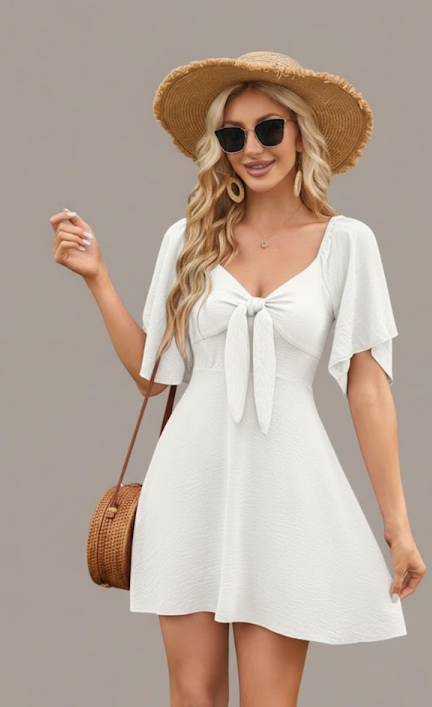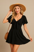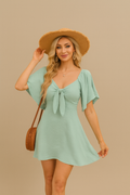 A breezy mini dress designed with soft flutter sleeves and a playful front knot detail. The relaxed silhouette flatters effortlessly, making it perfect for daytime adventures, vacations, or just soaking in the sunshine.