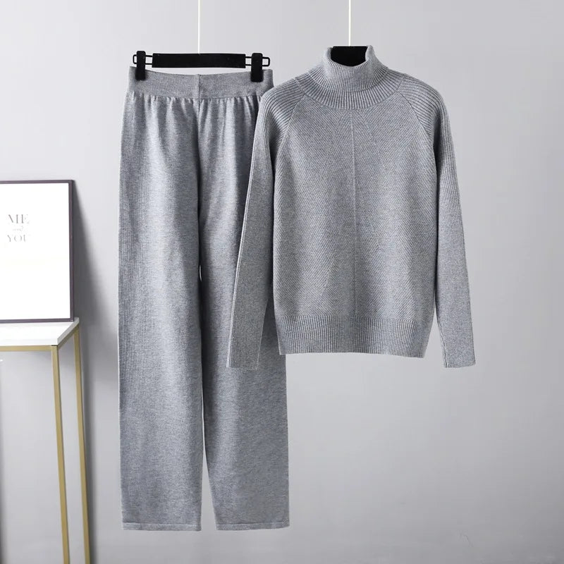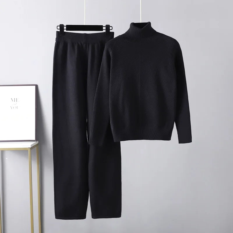A cozy and stylish ensemble designed for comfort and warmth. This coordinated set features knitted pants paired with a matching turtleneck long sleeve top, crafted from soft and luxurious fabric for a chic and comfortable look.