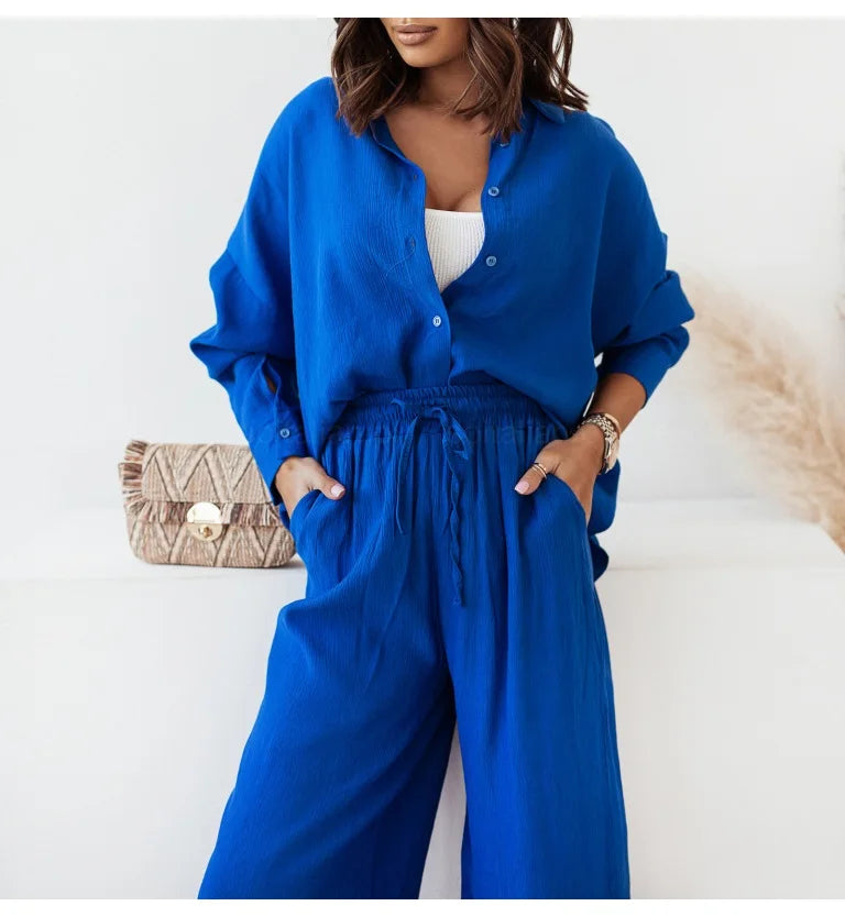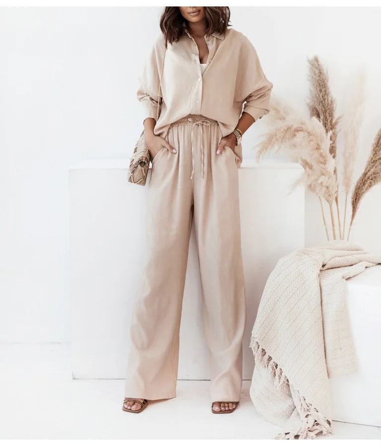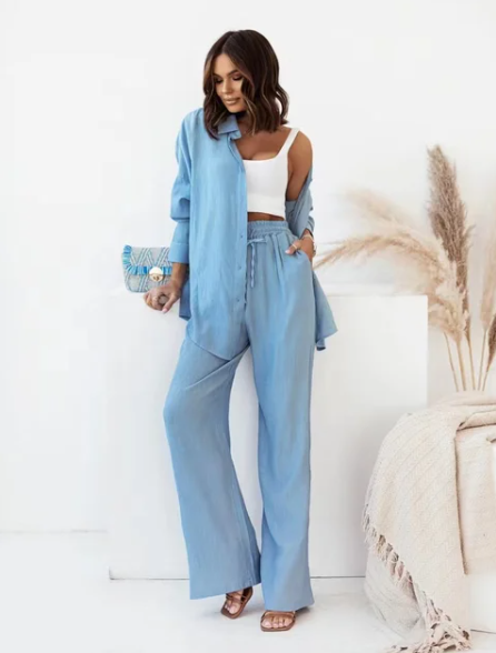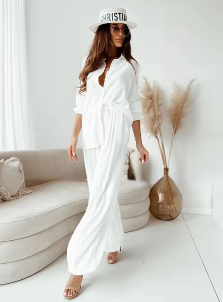 A relaxed yet refined two-piece crafted from breathable linen — this set pairs a classic button-up shirt with easygoing drawstring trousers for effortless style and comfort.