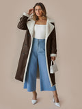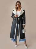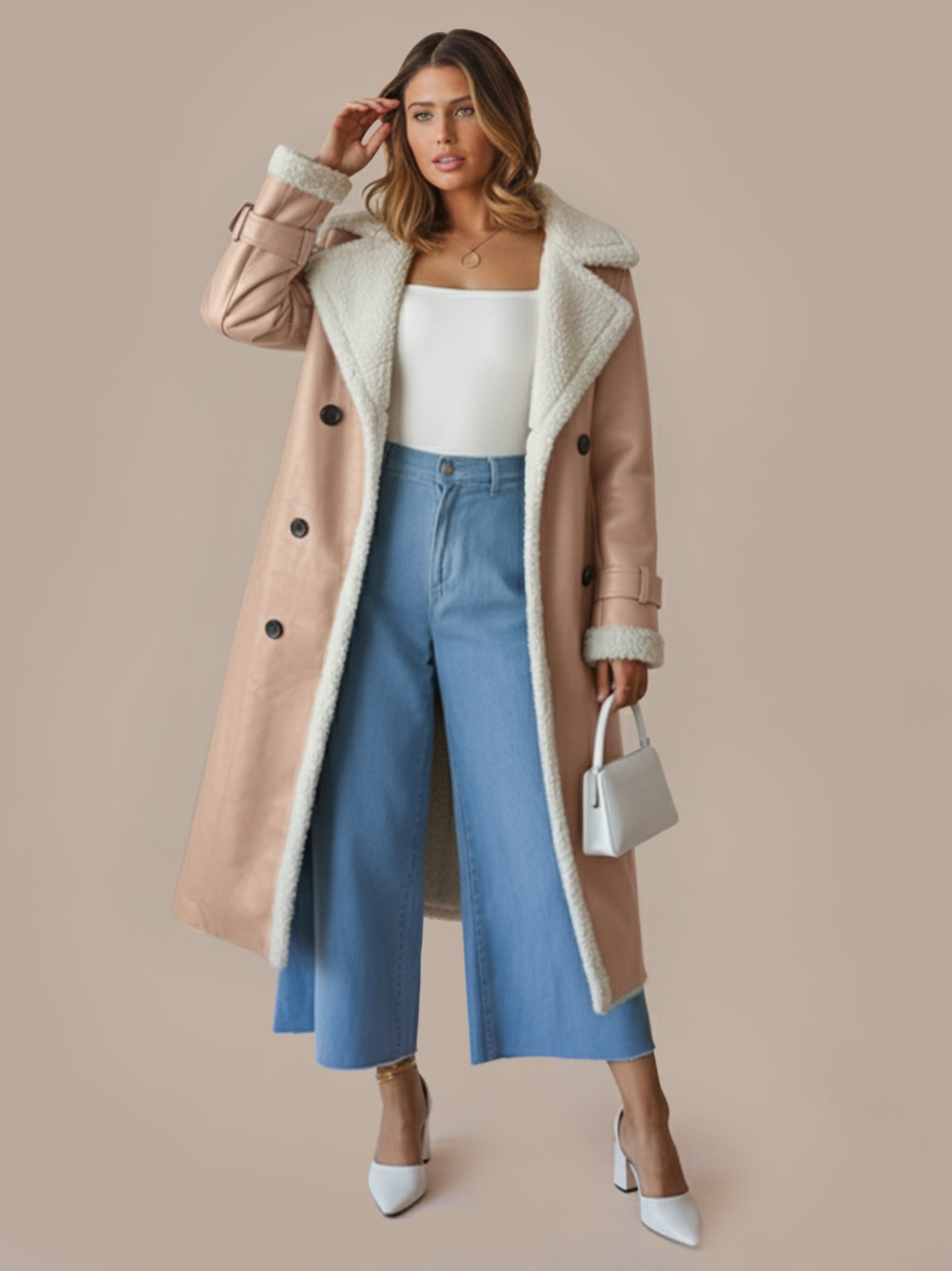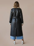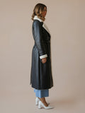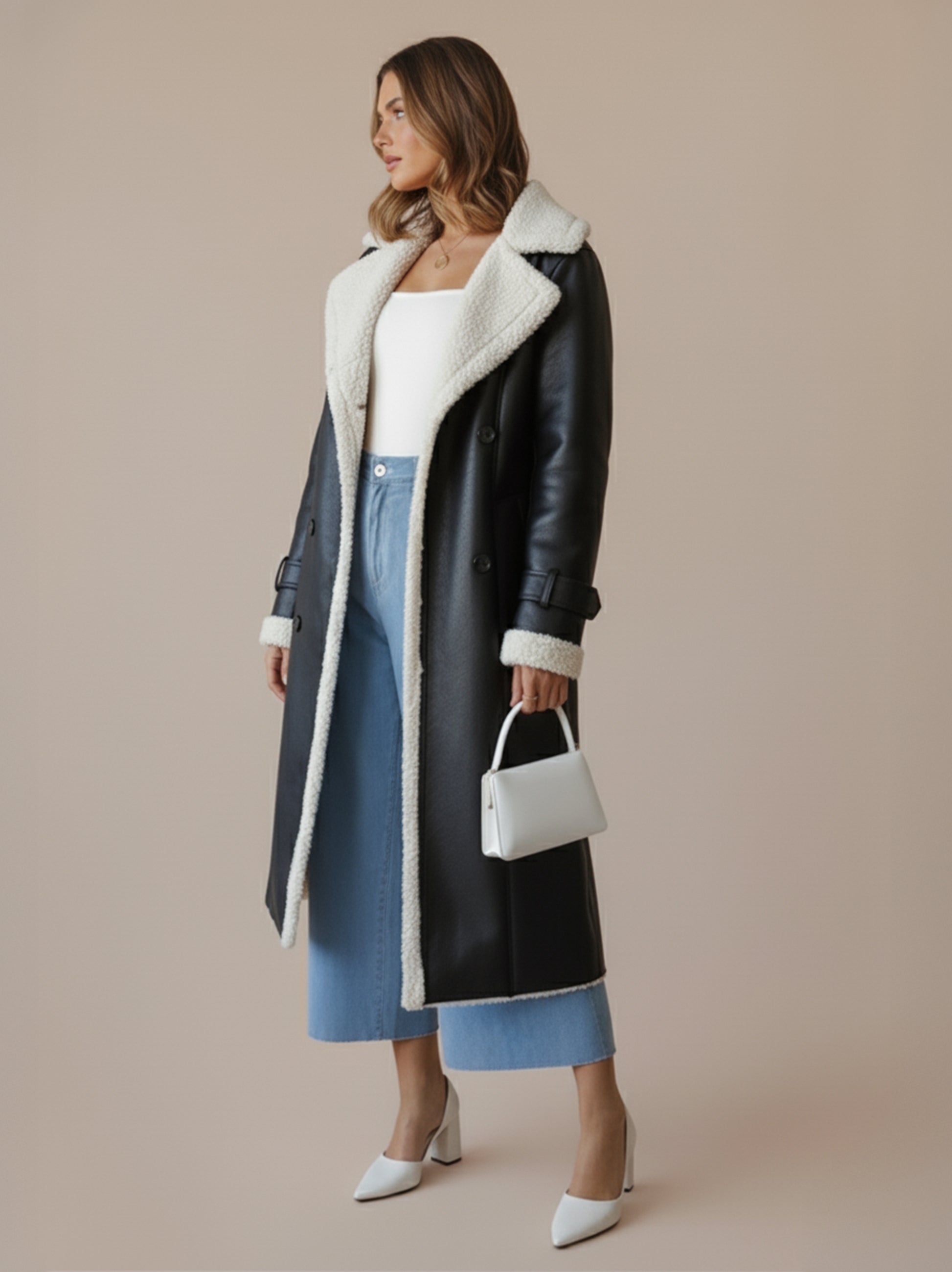 A dramatic silhouette meets cozy warmth in this longline trench. Crafted with a sleek faux leather exterior and plush shearling lining, it features a belted waist, structured lapels, and clean edge detailing. Perfect for making a cold-weather statement.