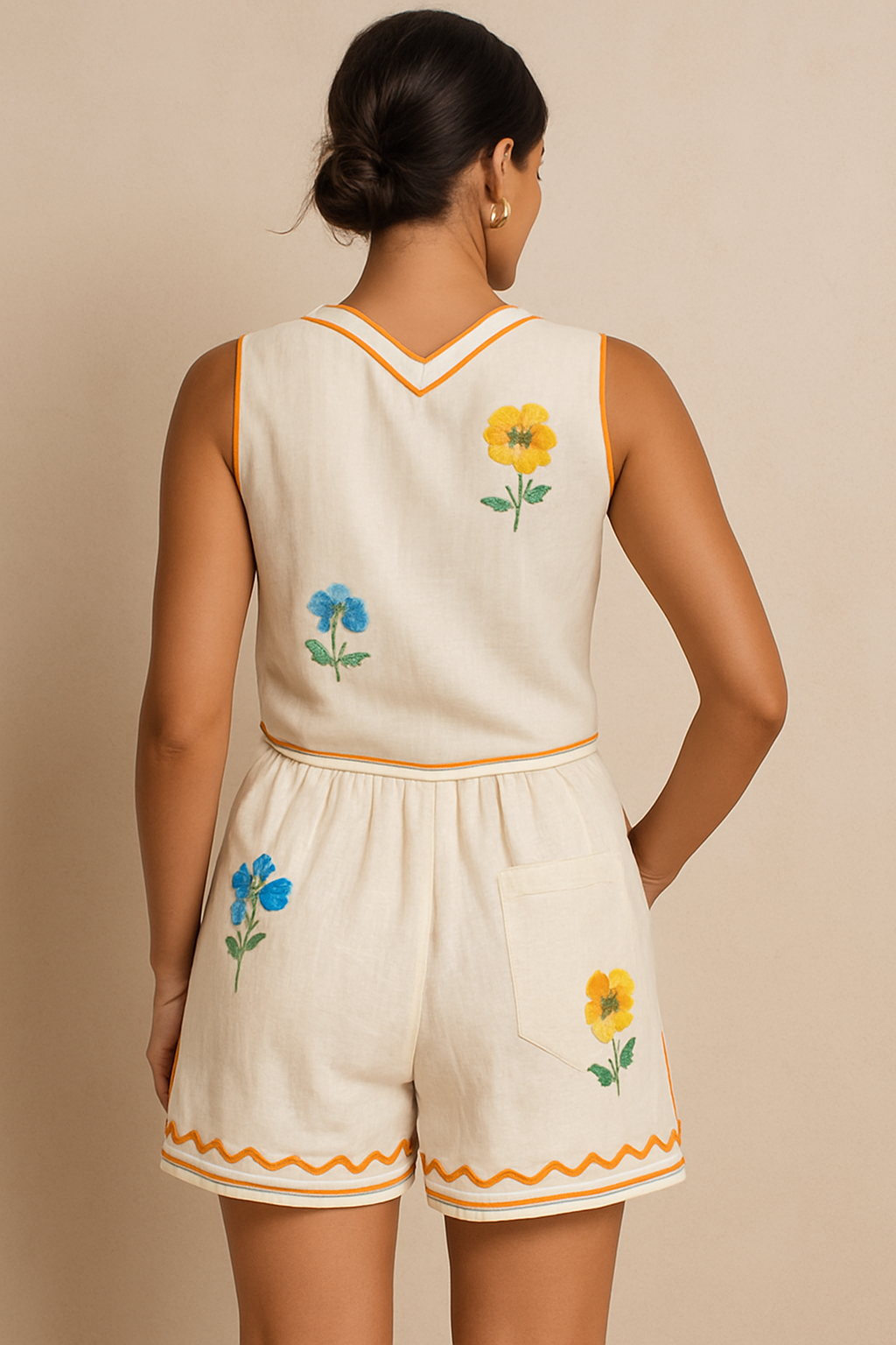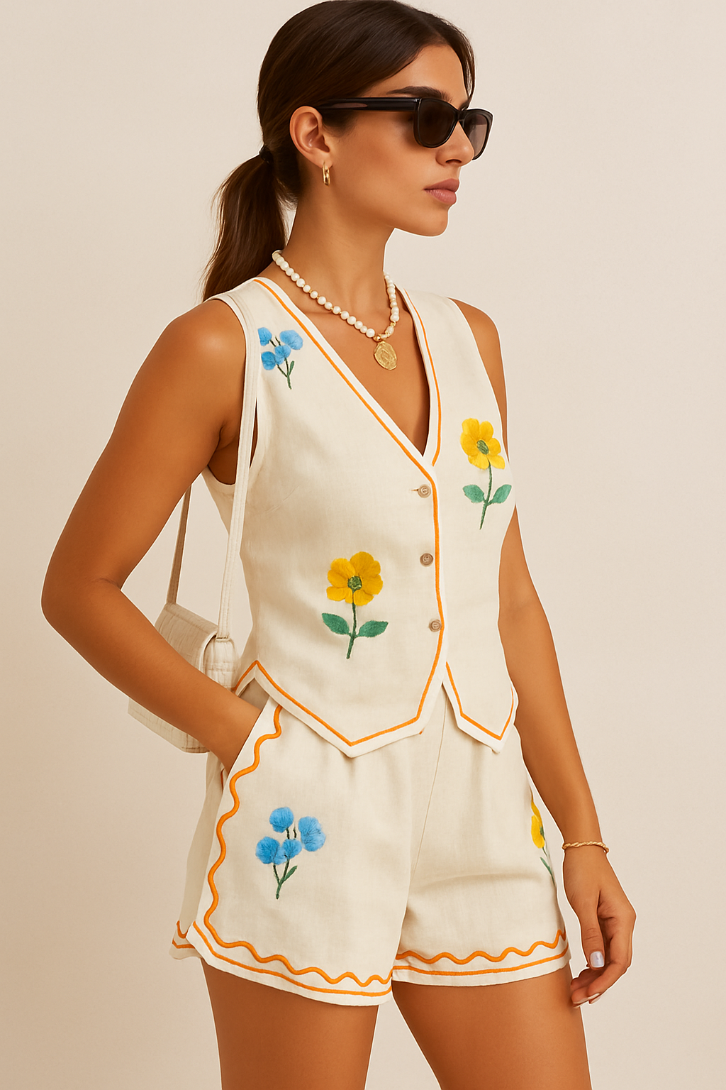 Versatile Styling Options: Whether paired with a flowing skirt for a romantic appeal or layered over a blouse and trousers for a polished ensemble, the Lulu Floral Embroidery Vest Set offers endless possibilities for chic styling.