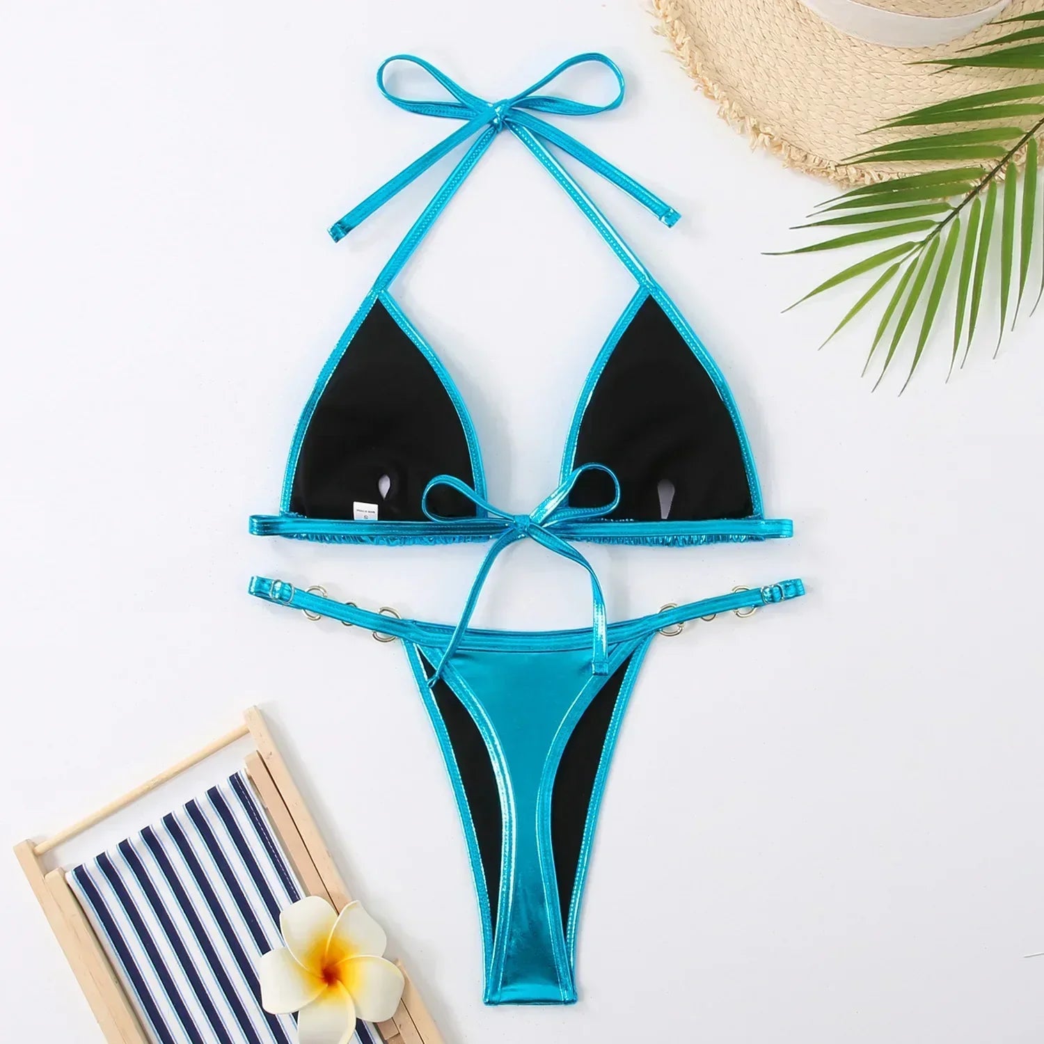 Make a bold statement this summer with our Metallic Triangle Thong Bikini. Whether you're lounging in the sun or taking a dip in the water, this bikini is sure to make you look and feel fabulous!