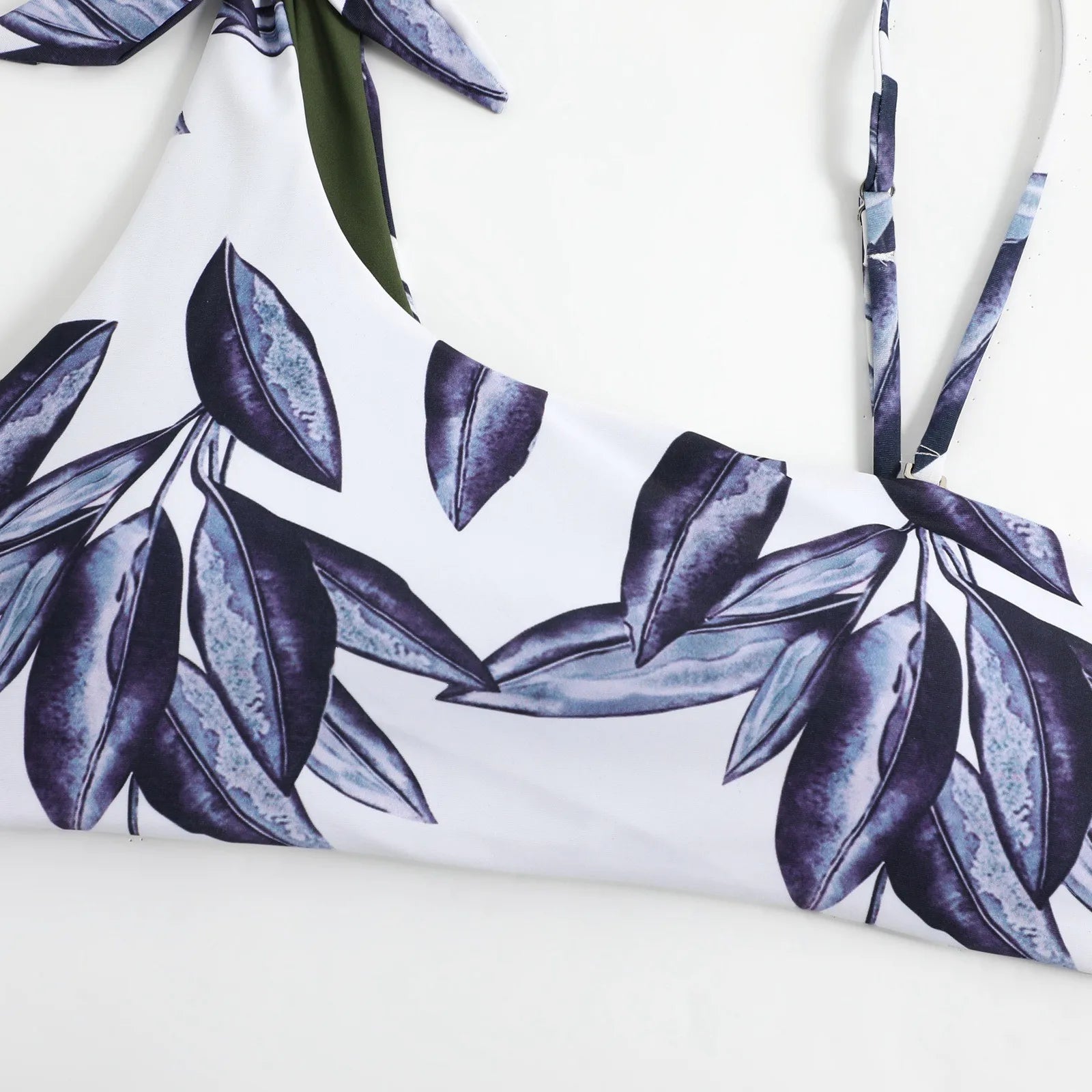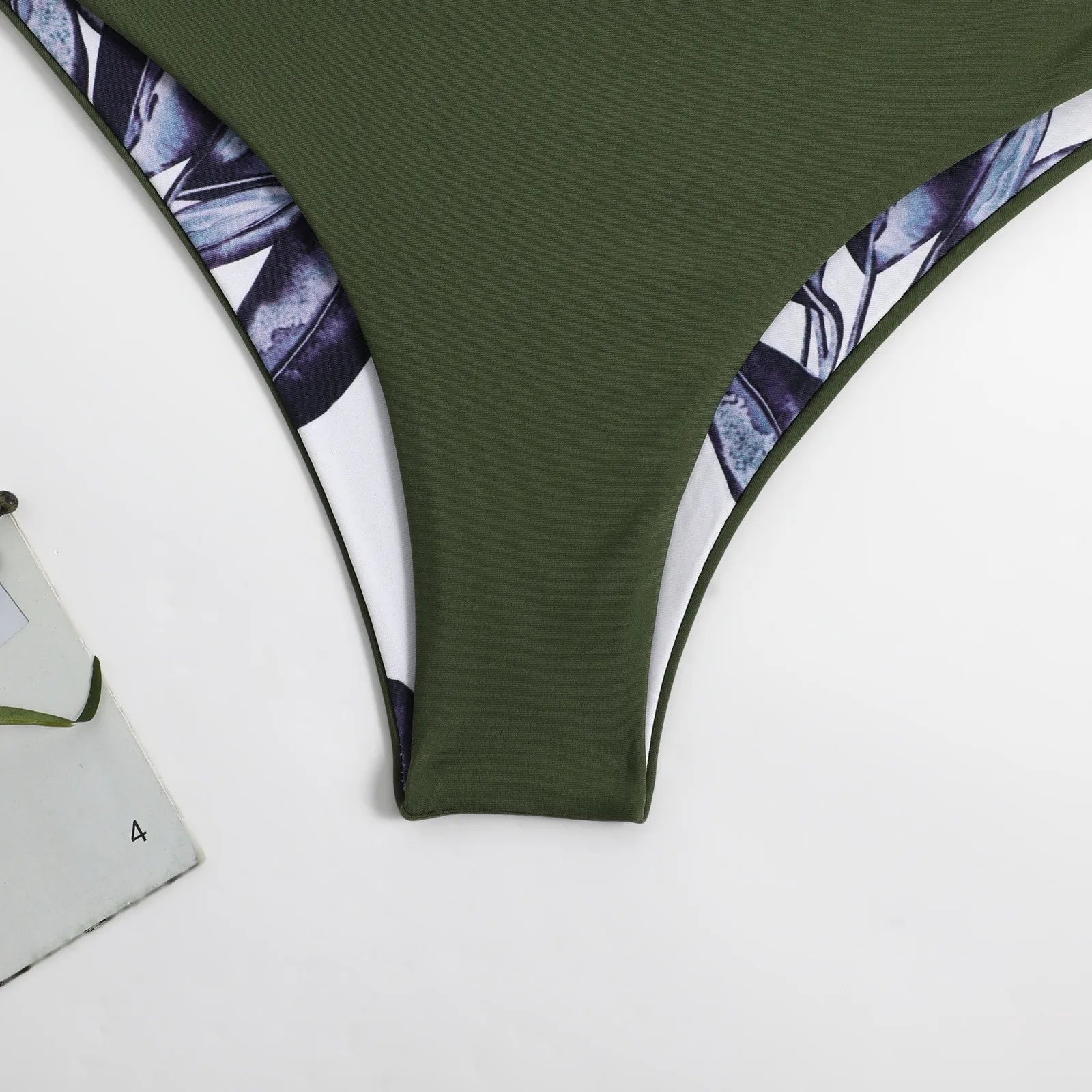 - Solid Color Bottom: The swimsuit bottom is a solid color, providing a stylish contrast to the patterned top.