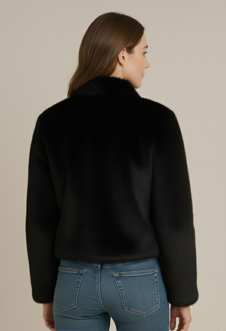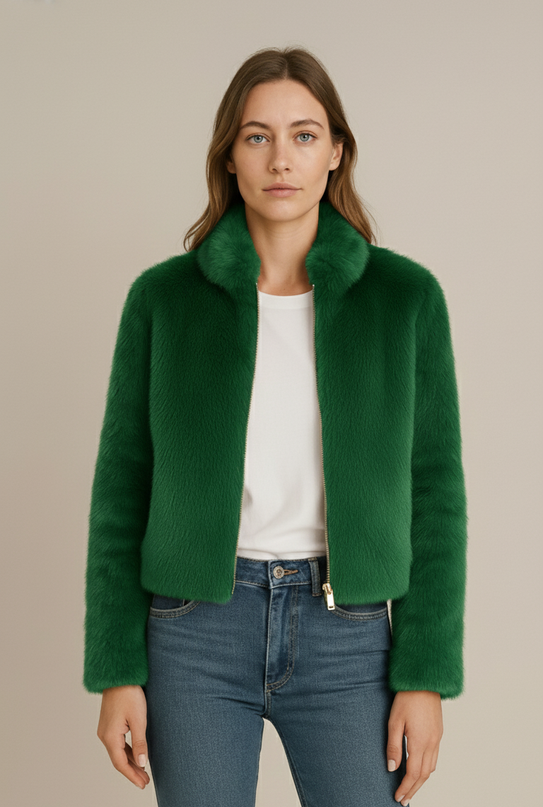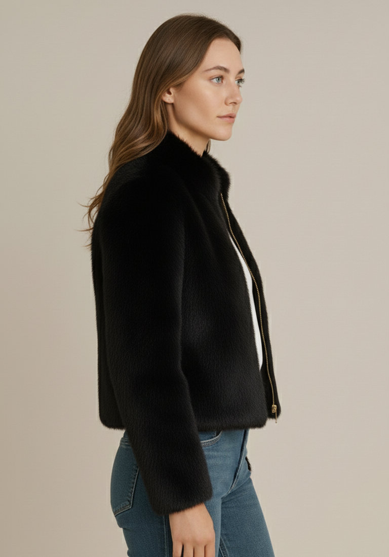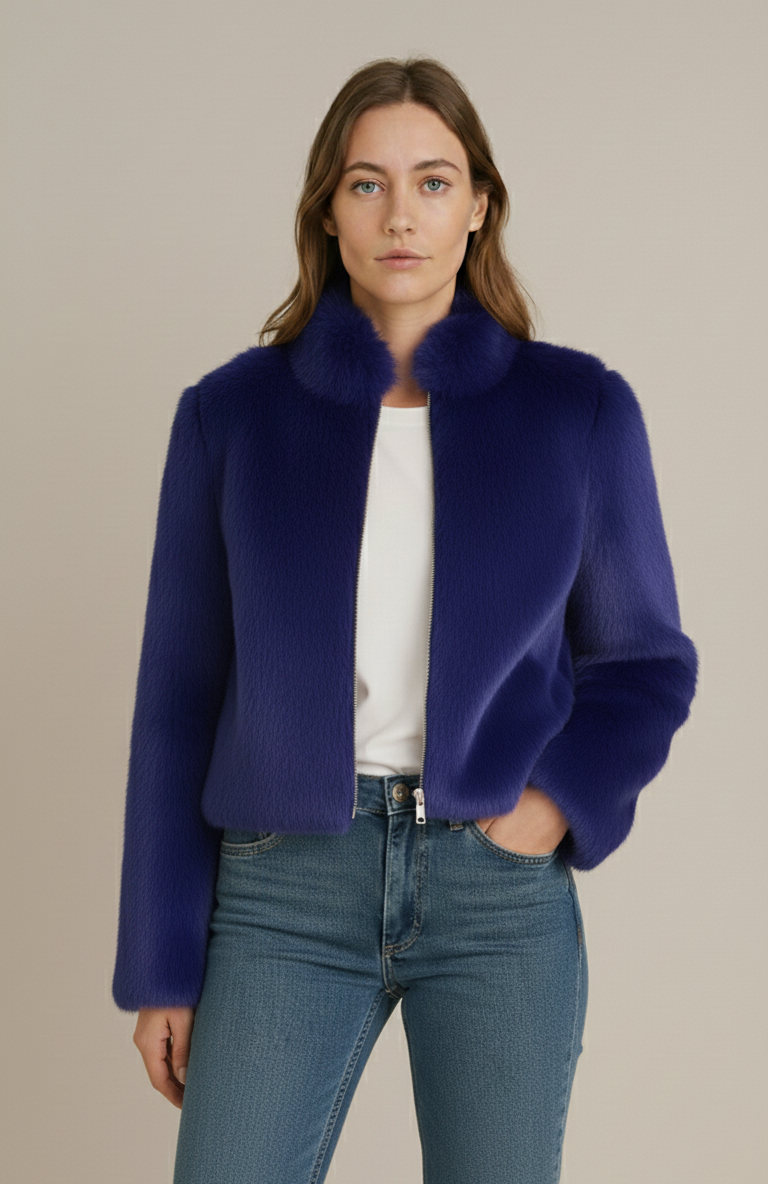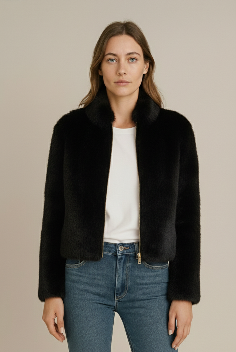 Surround yourself with elegance and warmth with the Nancy Elegant Faux Fur Jacket with high collar and zipper in faux fur. Designed with a stylish high collar and soft faux fur, this jacket gives an elegant look while keeping you warm. The full zip adds a modern touch and allows for adjustable coverage, making it perfect for layering over your favorite outfits.