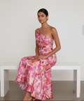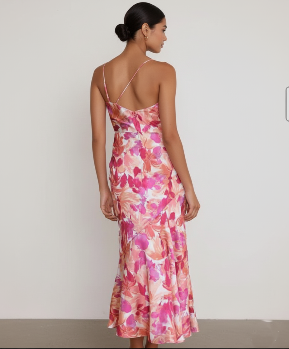 Soft, feminine, and effortlessly elegant—this floral midi is cut on the bias for a fluid drape that hugs in all the right places. The asymmetrical one-shoulder neckline adds a modern edge, while the flared hem brings movement and ease. Perfect for garden parties, summer weddings, or warm evening getaways.