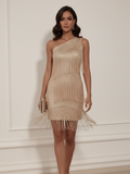 • Detail: Asymmetrical one-shoulder cut, layered fringe hem, side zipper closure
