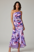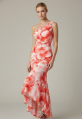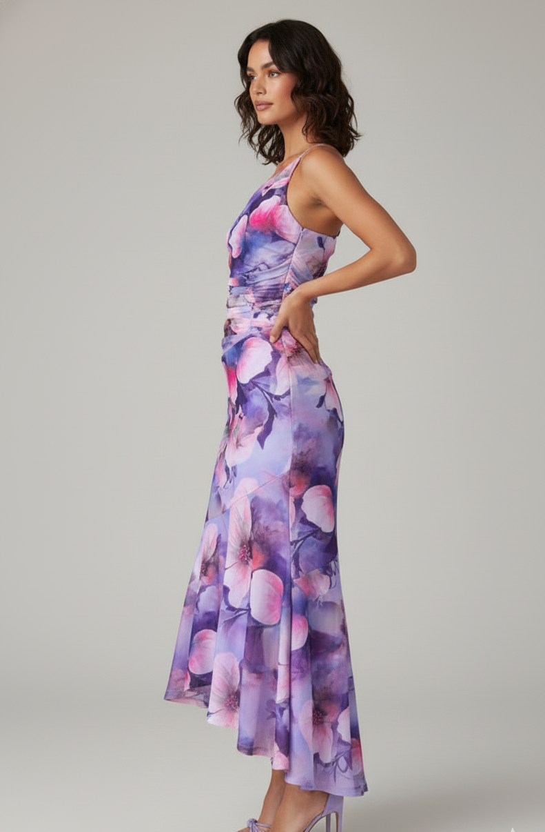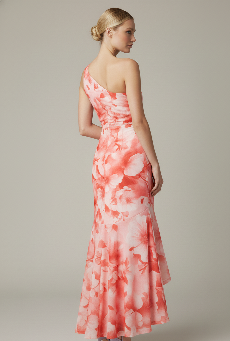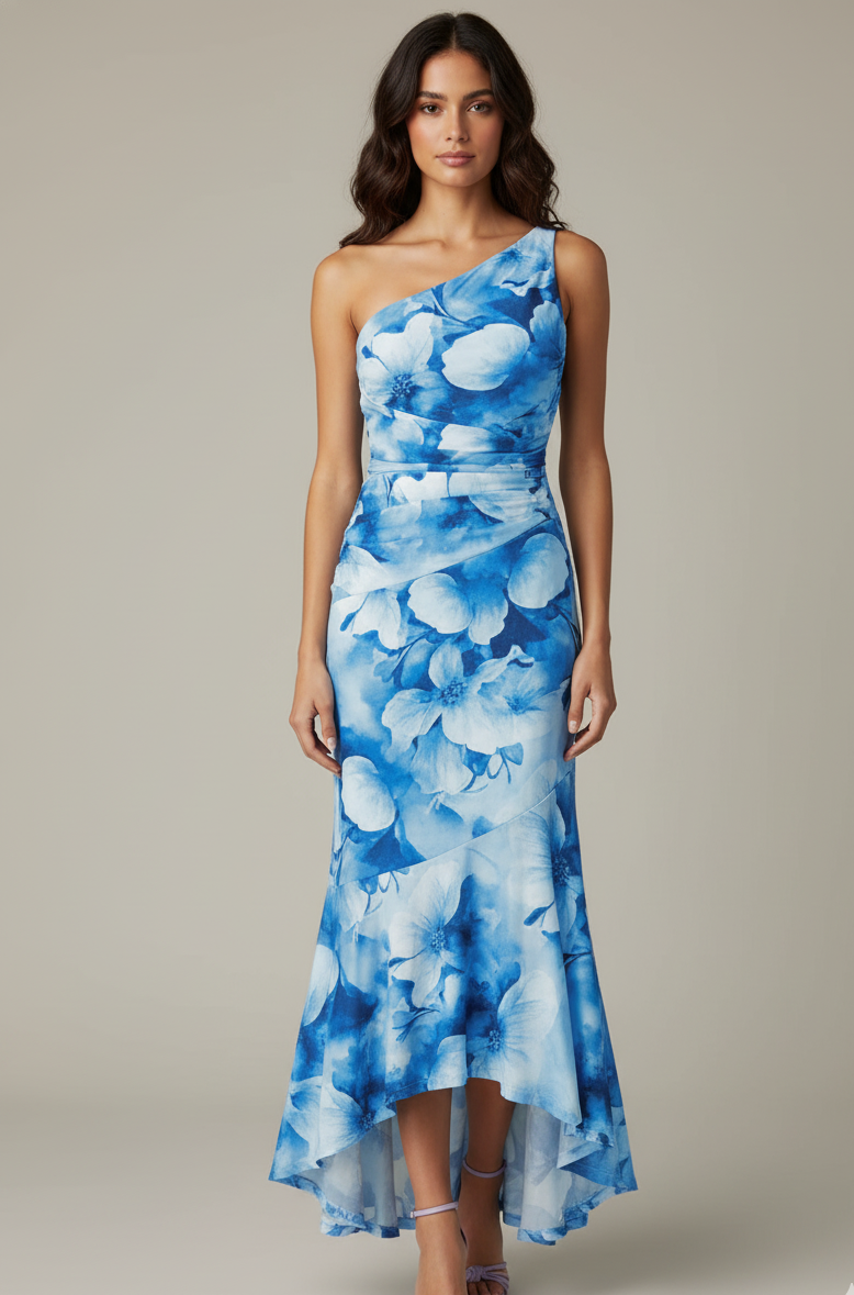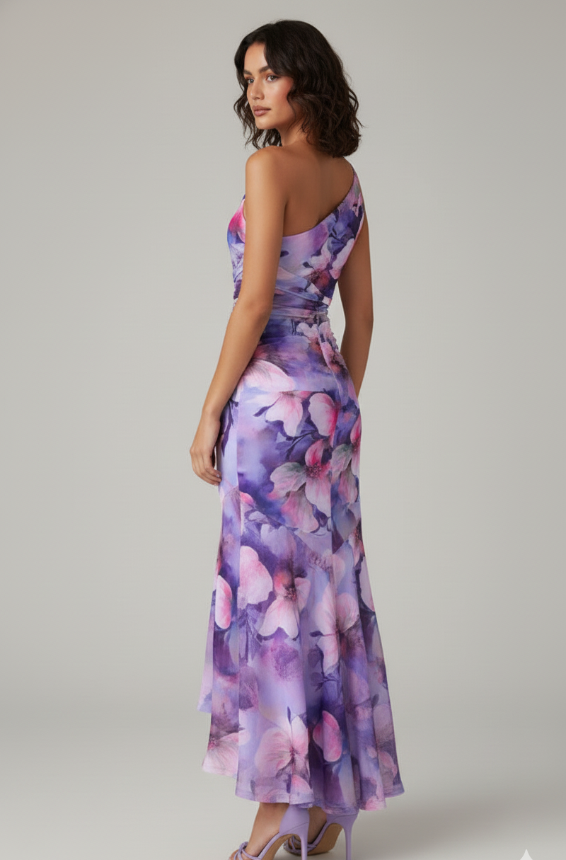 An elegant one-shoulder silhouette meets a soft ruched bodice and dreamy flared hem. This floral dress hugs your shape in all the right places, with a painterly print that flows like petals in motion. Perfect for garden parties, evening dinners, or summer weddings.