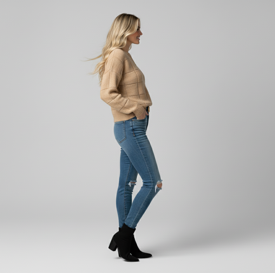 Enhance your everyday wardrobe with the Peggy Knitted Sweater. Enjoy the blend of comfort, style, and practicality with this essential piece that effortlessly complements any look.