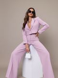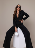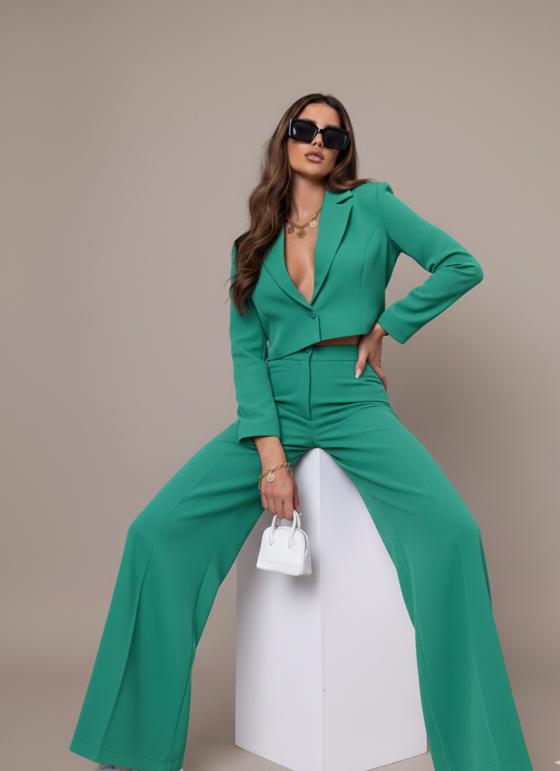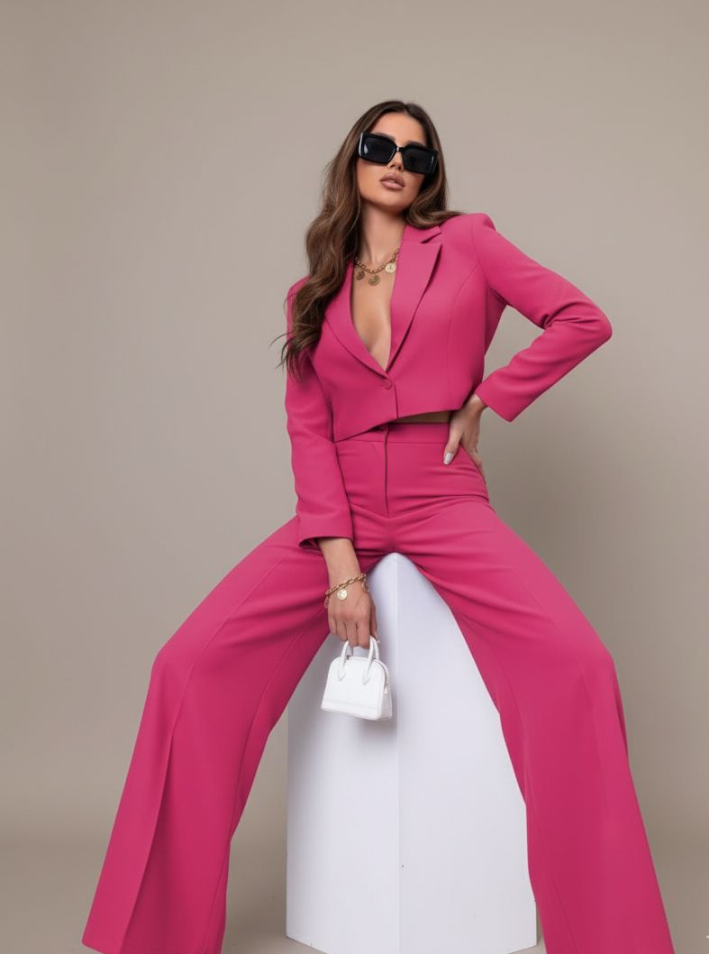 A chic and sophisticated ensemble designed to make a statement. This suit features a cropped blazer paired with coordinating pants, offering a modern twist on classic tailoring for a contemporary look.