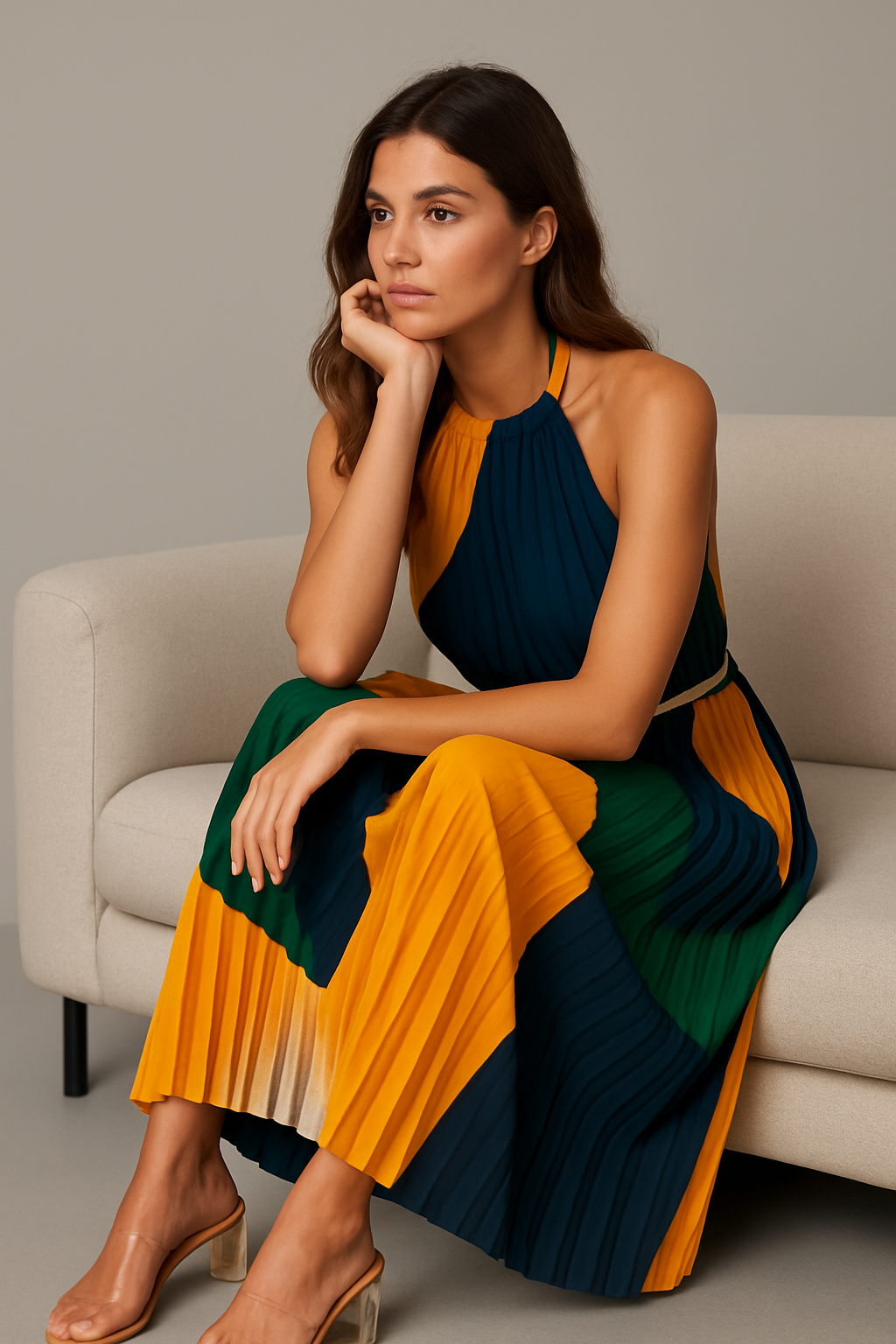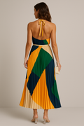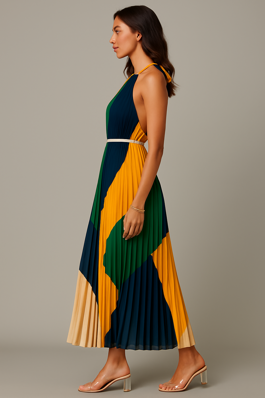 This is our Pleated Halter Tie-Waist Maxi Dress