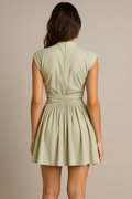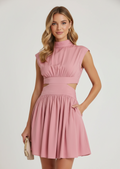 Detail: Sleeveless cut, high neckline, pleated texture, and mini length