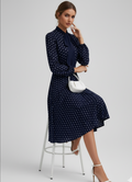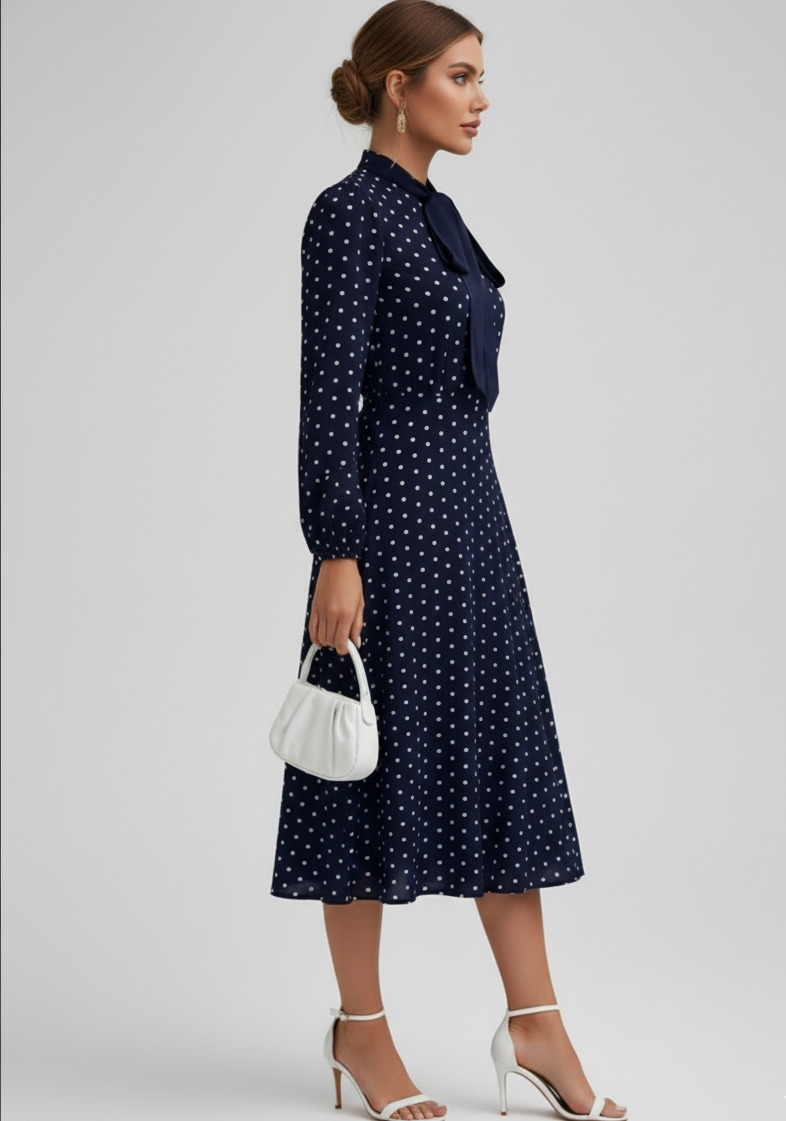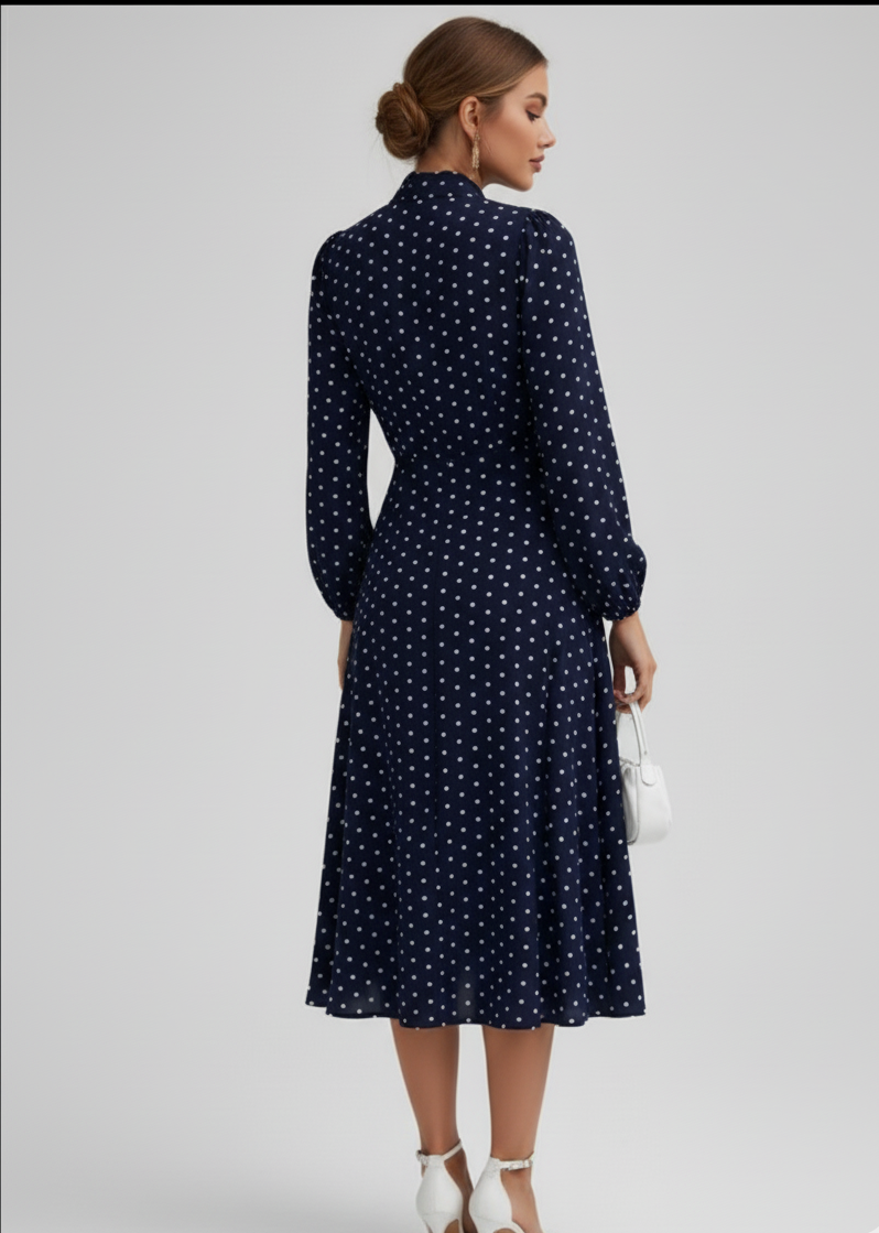 Playful yet refined, this polka dot midi dress blends vintage charm with modern flair — an easy choice when you want to feel effortlessly feminine.