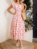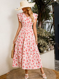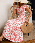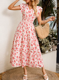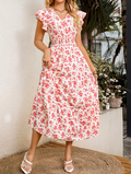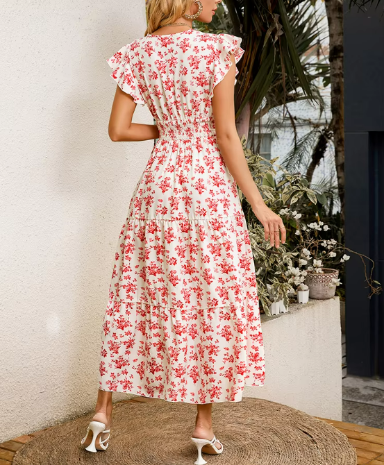 A breezy and romantic tiered midi dress featuring delicate flutter sleeves, a shirred waistline, and an all-over floral pattern that feels made for sunlit strolls. A relaxed yet flattering silhouette that moves effortlessly from day to night.